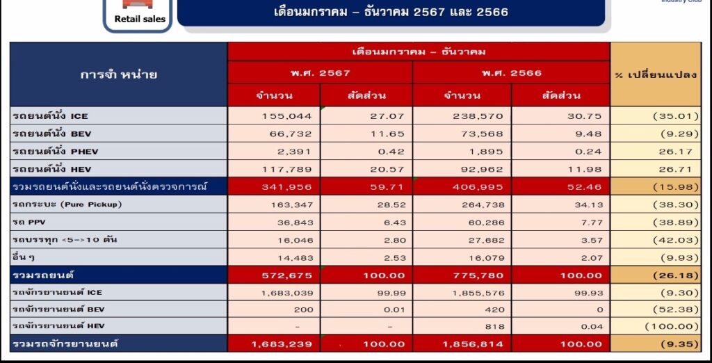กรุงเทพฯ 28 ม.ค. – รถยนต์ไฮบริดมาแรงปี 67 ยอมรับแบงก์ปฏิเสธปล่อยกู้กว่าร้อยละ 70 ยอดขายตก ห่วง “ทรัมป์” เข้มงวด นำเข้ารถยนต์ กังวลรถยนต์ไฟฟ้าจีนทุ่มตลาดในปี 68