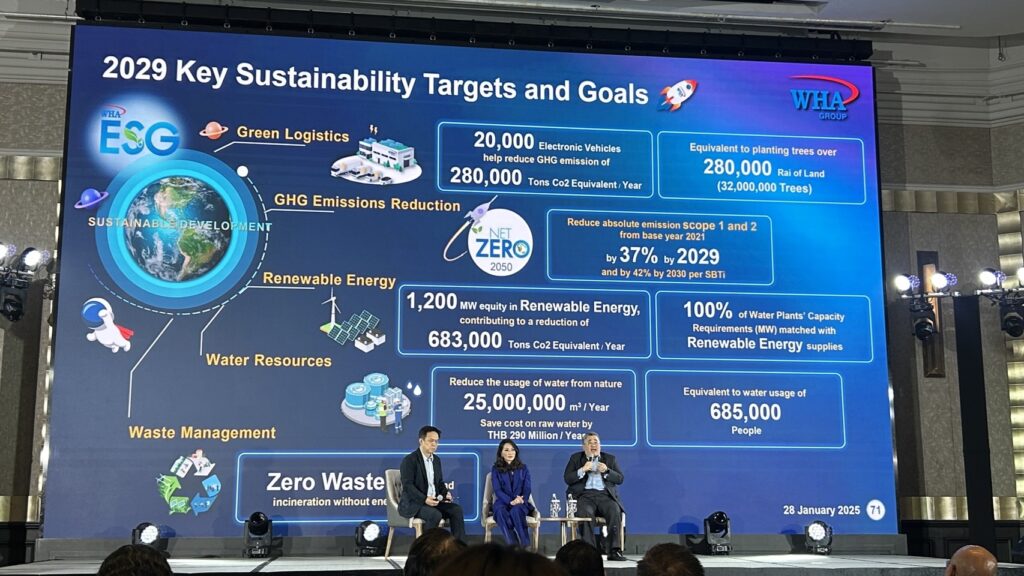 WHA Group ให้ความสำคัญกับการลดผลกระทบต่อสิ่งแวดล้อม และการสร้างคุณค่าให้กับสังคม ด้วยความมุ่งมั่นที่จะบรรลุเป้าหมายการพัฒนาอย่างยั่งยืนภายในปี 2572 อย่างเป็นรูปธรรม ได้แก่ การส่งเสริมการใช้ยานยนต์ไฟฟ้า โดยตั้งเป้าหมายจำนวนรถยนต์ไฟฟ้าให้บริการประมาณ 20,000 คัน การเพิ่มสัดส่วนการใช้พลังงานหมุนเวียน โดยตั้งเป้าหมายมีกำลังการผลิตไฟฟ้าจากพลังงานหมุนเวียนประมาณ 1,200 เมกะวัตต์ ซึ่งจะช่วยลดการปล่อยก๊าซเรือนกระจกได้ประมาณ 683,000 ตันคาร์บอนไดออกไซด์เทียบเท่าต่อปี การลดการใช้น้ำจากธรรมชาติลงประมาณ 25,000,000 ลูกบาศก์เมตรต่อปี เทียบเท่ากับปริมาณการใช้น้ำของภาคครัวเรือนกว่า 685,000 คน และการจัดการขยะแบบ Zero Waste ที่จะไม่มีการฝังกลบหรือเผาทำลาย เพื่อขับเคลื่อนสู่อนาคตที่ยั่งยืนอย่างแท้จริง. -517- สำนักข่าวไทย