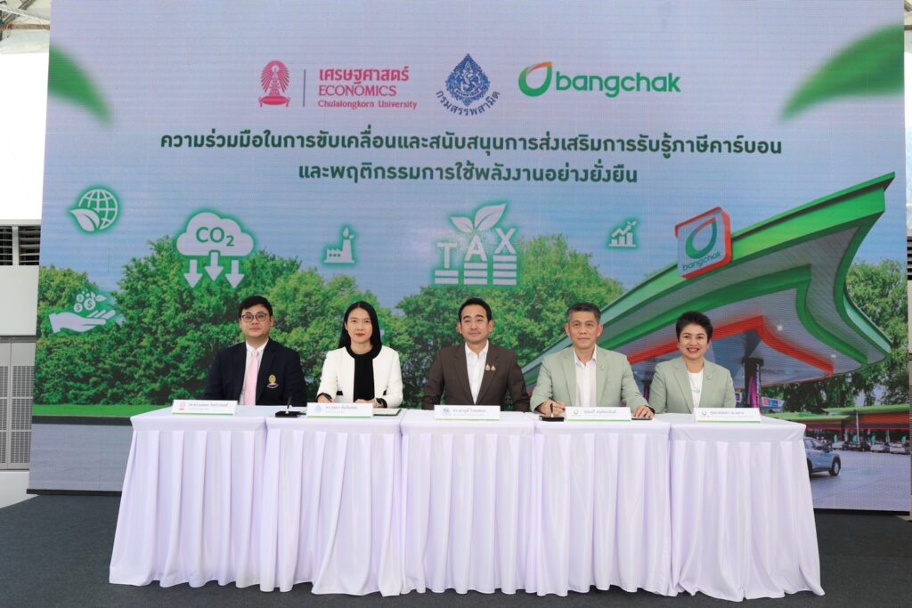 ดร.เผ่าภูมิ โรจนสกุล รัฐมนตรีช่วยว่าการกระทรวงการคลัง เป็นประธานการลงนาม MOU ระหว่างคณะเศรษฐศาสตร์ จุฬาลงกรณ์มหาวิทยาลัย, บริษัท ปตท. น้ำมันและการค้าปลีก จำกัด (มหาชน) (OR) และบริษัท บางจาก คอร์ปอเรชั่น จำกัด (มหาชน) ร่วมขับเคลื่อนและสนับสนุนการส่งเสริมการรับรู้ภาษีคาร์บอนและพฤติกรรมการใช้พลังงานอย่างยั่งยืน มุ่งหวังส่งเสริมด้านพฤติกรรมการใช้พลังงาน รองรับเข้าสู่สังคมคาร์บอนต่ำ