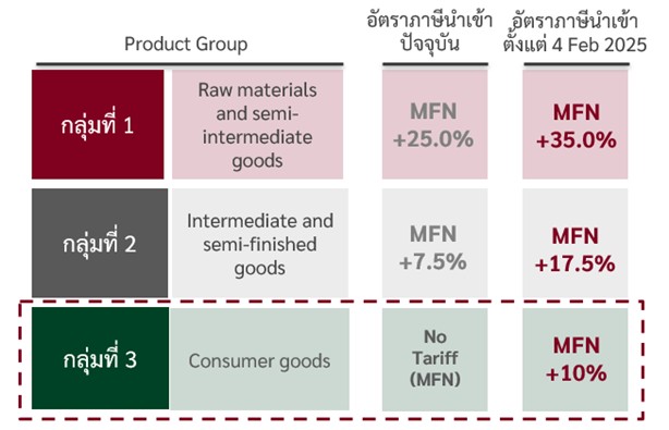 ศูนย์วิจัยกสิกรไทย รายงานว่าหลังประธานาธิบดีสหรัฐฯ ลงนามคำสั่งฝ่ายบริหาร (Executive orders) ปรับขึ้นภาษีนำเข้าจากจีนที่ 10% รวมถึงเม็กซิโกและแคนาดาที่ 25% ซึ่งจะมีผลบังคับใช้ในวันที่ 4 ก.พ.2568 ด้านรัฐบาลจีนระบุว่าจะร้องเรียนต่อองค์กรการค้าโลก (WTO) แต่ยังไม่ได้ระบุถึงมาตรการตอบโต้ด้านอื่น ๆ อย่างชัดเจน การปรับขึ้นภาษีนำเข้าของสหรัฐฯ เร็วกว่าที่คาดการณ์ ซึ่งคาดว่า 10% เป็นเพียงอัตราเบื้องต้นที่สหรัฐฯ จะเริ่มเก็บจากทางจีน โดยสหรัฐฯ นำเข้าจากจีน ใน 11 เดือนแรกของปี 2567 อยู่ที่ 401.4 พันล้านดอลลาร์สหรัฐฯ ในระยะต่อไปจึงคาดว่าการเร่งส่งออกจากจีนไปสหรัฐฯ จะยังคงมีอยู่ โดยเฉพาะสินค้าอุปโภคบริโภคของจีนที่คาดว่าจะได้รับผลกระทบจากการปรับขึ้นภาษีมากที่สุด เนื่องจากสินค้ากลุ่มนี้ยังไม่เคยถูกจัดเก็บภาษีในสงครามการค้ารอบก่อน