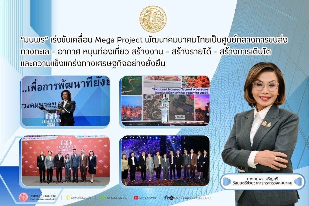 นางมนพร เจริญศรี รัฐมนตรีช่วยว่าการกระทรวงคมนาคม กล่าวปาฐกถา หัวข้อ “Mega Project Mega Power : พลิกโฉมโครงสร้างพื้นฐานเพื่อการพัฒนาที่ยั่งยืน” ในงาน “Go Thailand 2025 : “Women Run the World” 45 ปี ฐานเศรษฐกิจ ว่า รัฐบาลภายใต้การบริหารงานของนายกรัฐมนตรี นางสาวแพทองธาร ชินวัตร ประกอบกับ นายสุริยะ จึงรุ่งเรืองกิจ รองนายกรัฐมนตรี และรัฐมนตรีว่าการกระทรวงคมนาคม มีนโยบายในการเดินหน้าการลงทุนพัฒนาโครงสร้างพื้นฐานด้านคมนาคมขนาดใหญ่ หรือ Mega Project เพื่อขับเคลื่อนประเทศไทยท่ามกลางความท้าทายต่าง ๆ โดยรัฐบาลต้องการเปลี่ยน “ความท้าทาย” ให้กลายเป็น “ความหวัง โอกาส และความเสมอภาคทางเศรษฐกิจ และสังคม” ของคนทุกกลุ่มอย่างเท่าเทียม กระทรวงคมนาคมจึงได้เร่งรัดดำเนินโครงการต่าง ๆ เพื่อสร้างโอกาสและพลิกโฉมให้กับประเทศไทยผ่านการลงทุนทั้งทางบก ทางราง ทางน้ำ และทางอากาศ อย่างเป็นระบบ