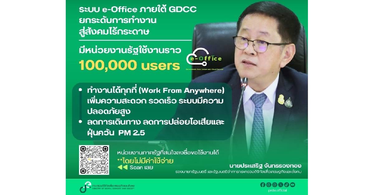 นายประเสริฐ จันทรรวงทอง รองนายกรัฐมนตรี และรัฐมนตรีว่าการกระทรวงดิจิทัลเศรษฐกิจและสังคม (ดีอี) กล่าวว่า กระทรวงดีอี ได้ดำเนินนโยบายการปรับเปลี่ยนภาครัฐสู่การเป็นรัฐบาลดิจิทัล โดยดำเนินการยกระดับหน่วยงานภาครัฐใช้ระบบงานเอกสารอิเล็กทรอนิกส์ (e-Document) ในระบบ e-Office ภายใต้ GDCC ซึ่งจัดทำและให้บริการ โดยกระทรวงดีอี เพื่อเพิ่มประสิทธิภาพการจัดการด้านเอกสาร และระบบอื่น ๆ ที่เกี่ยวข้องภายในองค์กร สนับสนุนการปรับเปลี่ยนสู่รัฐบาลดิจิทัลอย่างเต็มรูปแบบ ลดการใช้กระดาษ ลดการตัดต้นไม้ และลดขยะที่ต้องเผาทำลาย ซึ่งเป็น 1 ในสาเหตุการเกิดมลพิษทางอากาศ และ PM 2.5