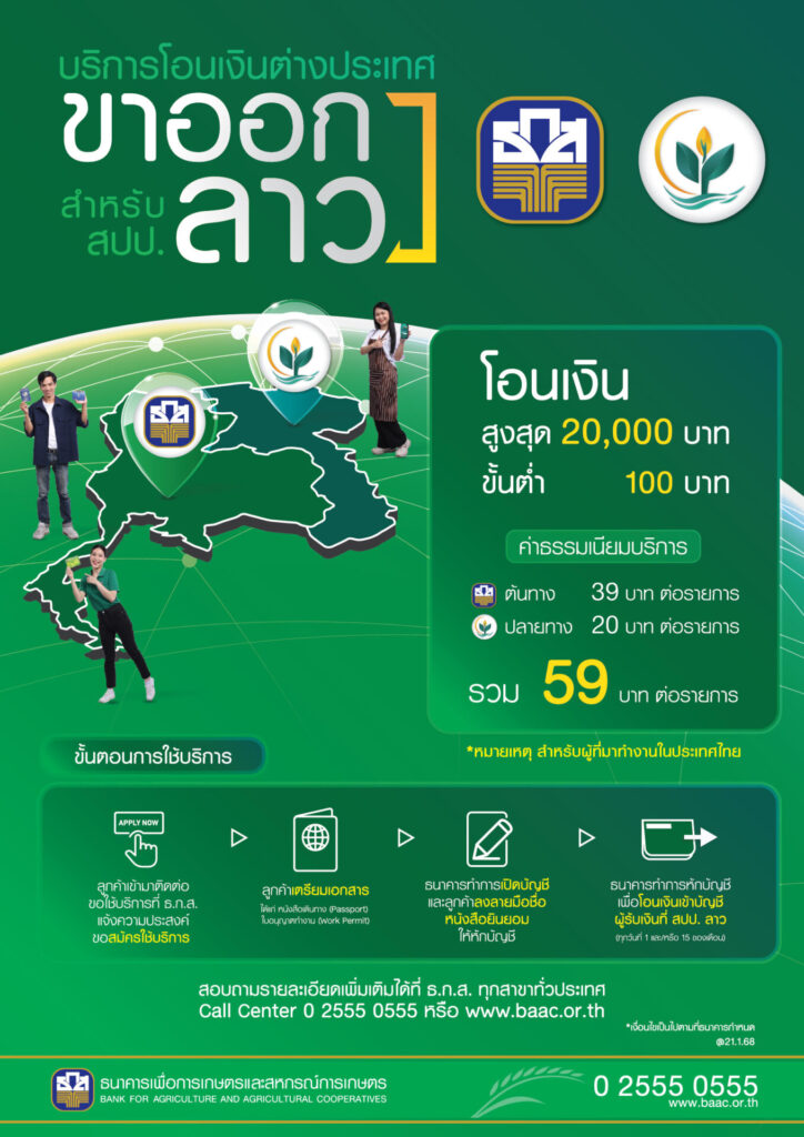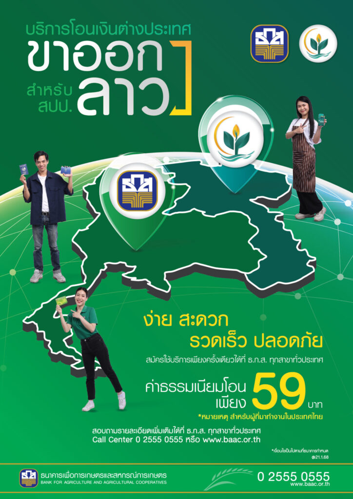 ธนาคารเพื่อการเกษตรและสหกรณ์การเกษตร (ธ.ก.ส.) และธนาคารส่งเสริมกสิกรรมแห่งสาธารณรัฐประชาธิปไตยประชาชนลาว (Agricultural Promotion Bank : APB) ร่วมลงนามบันทึกความเข้าใจ (MOU) ร่วมมือทางธุรกิจให้บริการทางการเงิน พร้อมเปิดตัวบริการโอนเงินระหว่างประเทศไทย-ลาว เพื่ออำนวยความสะดวกให้ประชาชนของทั้งสองประเทศ โดยเฉพาะชาว สปป.ลาว เดินทางเข้ามาทำงานในประเทศไทย ให้โอนเงินกลับประเทศได้อย่างรวดเร็ว ปลอดภัย และประหยัดค่าใช้จ่ายมากยิ่งขึ้น และคิดค่าธรรมเนียมต่ำ