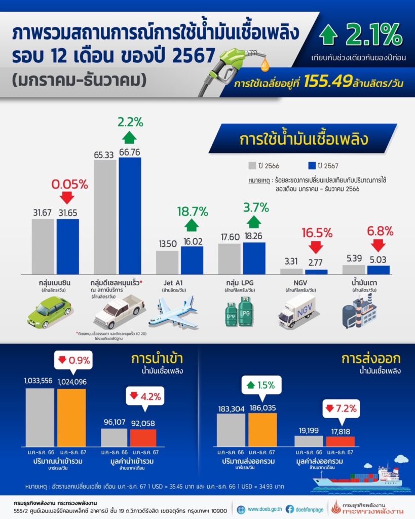 นายสราวุธ แก้วตาทิพย์ อธิบดีกรมธุรกิจพลังงาน เผยภาพรวมการใช้น้ำมันเชื้อเพลิง เฉลี่ยของปี 2567 ในส่วนน้ำมันดีเซลหมุนเร็ว ณ สถานีบริการเพิ่มขึ้นร้อยละ 2.2 น้ำมันอากาศยานเชิงพาณิชย์ (Jet A1) เพิ่มขึ้นร้อยละ 18.7 และการใช้ LPG เพิ่มขึ้นร้อยละ 3.7 ขณะที่กลุ่มเบนซินลดลงร้อยละ 0.05 การใช้น้ำมันเตาลดลงร้อยละ 6.8 และ NGV ลดลง ร้อยละ 16.5 แยกรายละเอียดดังนี้