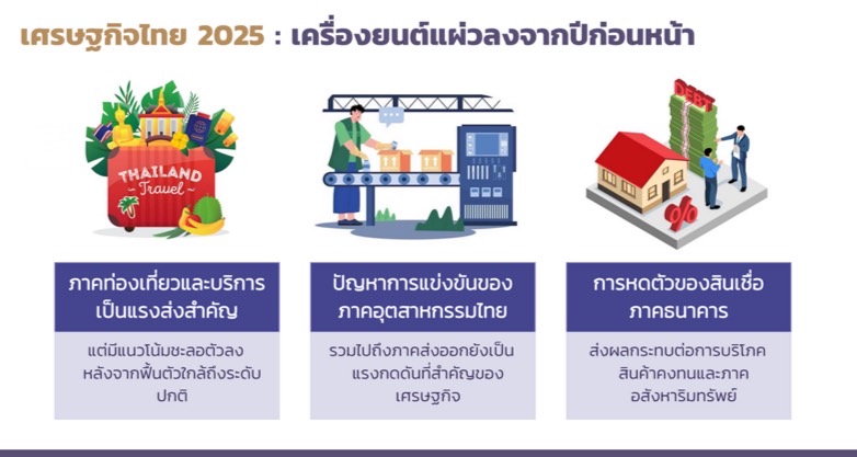 ดร.พิพัฒน์ เหลืองนฤมิตชัย หัวหน้านักเศรษฐศาสตร์ กลุ่มธุรกิจการเงินเกียรตินาคินภัทร หรือ KKP เผยว่าเศรษฐกิจไทยในปี 2568 มีแนวโน้มขยายตัวที่ 2.6% ชะลอตัวจากปีก่อนหน้าที่คาดไว้ที่ 2.7% เล็กน้อย โดยมีแรงส่งสำคัญจากภาคท่องเที่ยวและภาคบริการ อย่างไรก็ตาม แรงส่งนี้มีแนวโน้มชะลอตัวลงจากการฟื้นตัวกลับมาเกือบปกติของภาคท่องเที่ยว ในขณะที่ปัญหาความสามารถในการแข่งขันของภาคอุตสาหกรรมและภาคส่งออกยังเป็นแรงกดดันที่สำคัญต่อเศรษฐกิจไทย นอกจากนี้ การหดตัวของสินเชื่อภาคธนาคารจากปัญหาหนี้ครัวเรือนและภาวะเศรษฐกิจกำลังส่งผลทางลบต่อการบริโภคสินค้าคงทนและภาคอสังหาริมทรัพย์