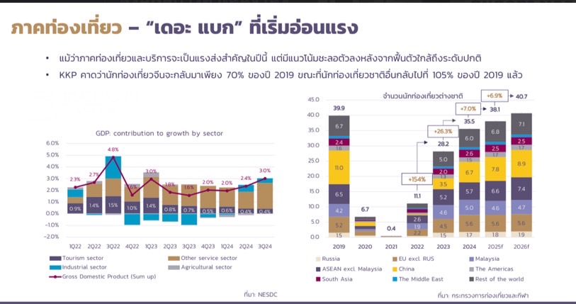 กรุงเทพฯ 6 ก.พ. – KKP มองเศรษฐกิจไทย ปี 2568 ชะลอตัว จากภาคการท่องเที่ยวเดอะแบกที่เริ่มอ่อนตัว-หนี้ครัวเรือนกดดัน จับตานโยบายสหรัฐฯ กระทบการค้า คาดจีดีพีโตเพียง 2.6% แนะปฏิรูปโครงสร้างเศรษฐกิจ หนุนลงทุน-ยกระดับศักยภาพเศรษฐกิจไทย