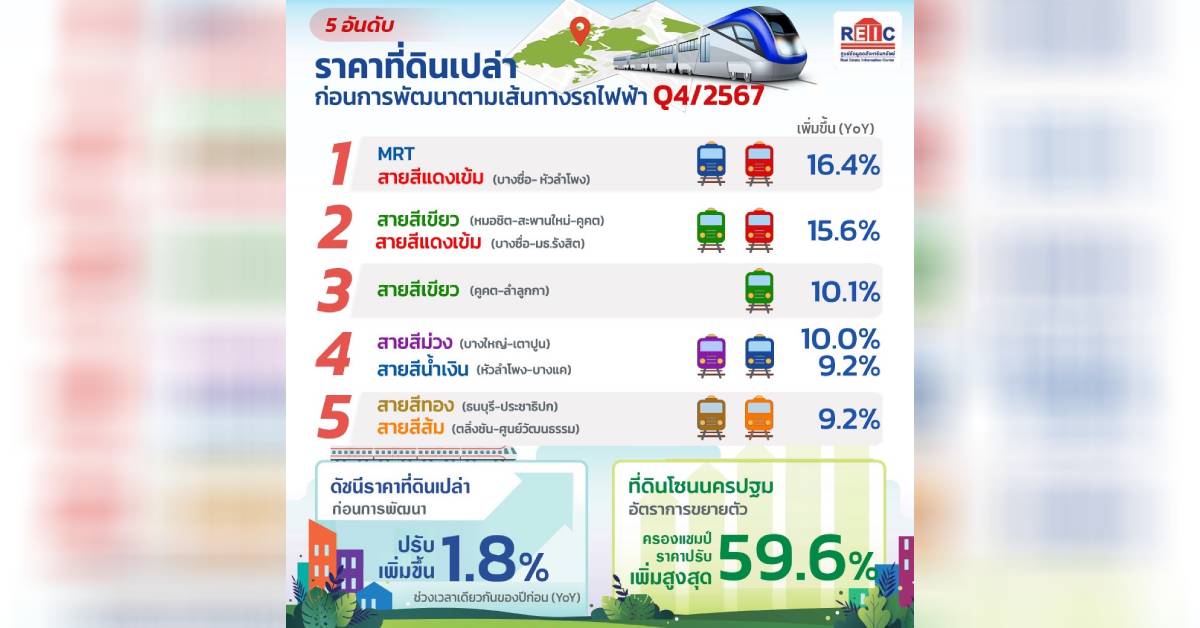 นอกจากนี้ REIC ยังได้จัดอันดับราคาที่ดินเปล่าก่อนการพัฒนาในแนวเส้นทางที่มีรถไฟฟ้าผ่าน พบว่าทำเลที่มีอัตราการขยายตัวของราคาที่ดินเพิ่มขึ้นสูงสุดเมื่อเทียบกับไตรมาสเดียวกันของปีก่อน (YoY) ส่วนใหญ่เป็นที่ดินที่มีโครงการรถไฟฟ้าเปิดให้บริการแล้ว และเป็นทำเลที่มีสถานีเชื่อมต่อระหว่างสถานีรถไฟฟ้าหรือสามารถเดินทางเชื่อมถึงกันได้ง่าย โดย 5 อันดับแรกที่มีอัตราการขยายตัวของราคาที่ดินเพิ่มขึ้นสูงสุด ประกอบด้วย