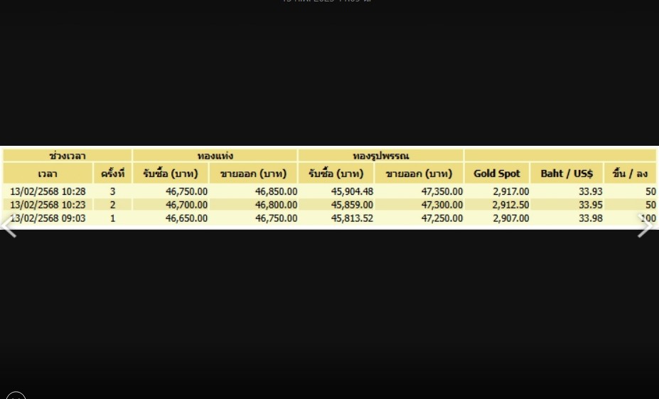 สมาคมค้าทองคำรายงานราคาทองคำ เมื่อเวลา 10.28 น. ราคาทองไทยขยับขึ้น 3 รอบจากวานนี้ รวมขึ้น 200 บาท/บาททองคำ โดยทองแท่งขายออกบาทละ 46,850 บาท ทองรูปพรรณ ขายออก 47,350บาท ขยับขึ้นจากตามราคาทองเอเชียที่บวกจากวานนี้ โดย Gold spot เคลื่อนไวที่ 2,917 ดอลลาร์ต่อออนซ์ ส่วนเงินบาทแข็งค่าขึ้นเคลื่อนไหว 33.93 บาท/ดอลลาร์สหรัฐ โดยวานนี้ทองไทยชะลอการขึ้นราคาหลังวันที่ 11 ก.พ.68 ราคาทองคำไทยสร้างสถิติสูงสุด ราคาทองแท่งขายออก 47,450 บาท ทองรูปพรรณ ขายออก 47,950 บาท บนฐานทองคำเอเชียที่ 2,942 ดอลลาร์/ออนซ์ และเงินบาท 34.07 บาท/ดอลลาร์ อย่างไรก็ตาม สัญญาทองคำตลาดนิวยอร์กปิดลบในวันพุธ (12 ก.พ.) หลังสหรัฐฯ เปิดเผยดัชนีราคาผู้บริโภค (CPI) ที่สูงเกินคาด ซึ่งทำให้นักลงทุนกังวลว่าธนาคารกลางสหรัฐฯ (เฟด) จะยังไม่ปรับลดอัตราดอกเบี้ยในเร็ว ๆ นี้ โดยสัญญาทองคำตลาด COMEX (Commodity Exchange) ส่งมอบเดือน เม.ย. ลดลง 3.90 ดอลลาร์ หรือ -0.13% ปิดที่ 2,928.70 ดอลลาร์/ออนซ์ โดยดัชนี CPI ทั่วไป (Headline CPI) ซึ่งรวมหมวดอาหารและพลังงาน ปรับตัวขึ้น 3.0% ในเดือน ม.ค. สูงกว่าที่นักวิเคราะห์คาดการณ์ที่ระดับ 2.9% และเพิ่มขึ้นจากระดับ 2.9% ในเดือน ธ.ค. ส่วนดัชนี CPI พื้นฐาน (Core CPI) ซึ่งไม่นับรวมหมวดอาหารและพลังงาน ปรับตัวขึ้น 3.3%