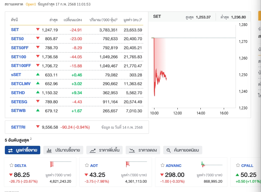 ตลาดหลักทรัพย์แห่งประเทศไทย เปิดเผยว่า ดัชนีตลาดหลักทรัพย์แห่งประเทศไทย (SET Index) เปิดภาคเช้าวันนี้ (17 ก.พ.) ปรับลดลง 31.96 จุด หรือ 2.51% ลดลงจากเมื่อวันศุกร์ที่ผ่านมา มาอยู่ที่ 1,240.14 จุด สาเหตุหลักมาจากการปรับลงของราคาหุ้น DELTA (บมจ.เดลต้า อีเลคโทรนิคส์ (ประเทศไทย) ที่ลดลงหลังข่าวผลประกอบการที่ลดลงต่ำกว่าที่นักวิเคราะห์คาดการณ์ และการปรับลดลงของหุ้น AOT (บมจ.ท่าอากาศยานไทย) เนื่องจากข่าวสัญญาสัมปทาน อย่างไรก็ตาม บริษัทได้ชี้แจงเพิ่มเติมมาแล้วเช้าวันนี้ โดย ณ เวลา 10.01 น.ดัชนี SET มาอยู่ที่ 1,237.10 จุด ลดลง 35.00 จุด (-2.75%) และเวลา 10.28 น. ดัชนี SET Index อยู่ที่ 1,248.57 จุด ปรับลดลง 1.85% หรือ 23.53 จุด