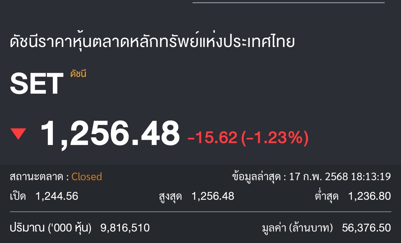 ตลาดหลักทรัพย์แห่งประเทศไทย (ตลท.) รายงานดัชนีตลาดหลักทรัพย์แห่งประเทศไทย (SET Index) ปิดตลาดวันนี้ (17 ก.พ.) ที่ระดับ 1,256.48 จุด ลดลง 15.62 จุด หรือ 1.23% จากเมื่อวันศุกร์ที่ผ่านมา โดยดัชนีปรับฟื้นขึ้นในการซื้อขายภาคบ่าย เนื่องจากราคาหลักทรัพย์ปรับสูงขึ้นกระจายในหลายกลุ่มอุตสาหกรรม เช่น กลุ่มเกษตรและอุตสาหกรรมอาหาร กลุ่มธุรกิจการเงิน กลุ่มอสังหาริมทรัพย์และก่อสร้าง กลุ่มสินค้าอุตสาหกรรม และกลุ่มทรัพยากร เป็นต้น โดยหากไม่รวมการเคลื่อนไหวของราคาหลักทรัพย์ DELTA และ AOT ดัชนี SET Index ปรับบวกกว่า 15 จุด ในทิศทางเดียวกับตลาดหุ้นในภูมิภาค