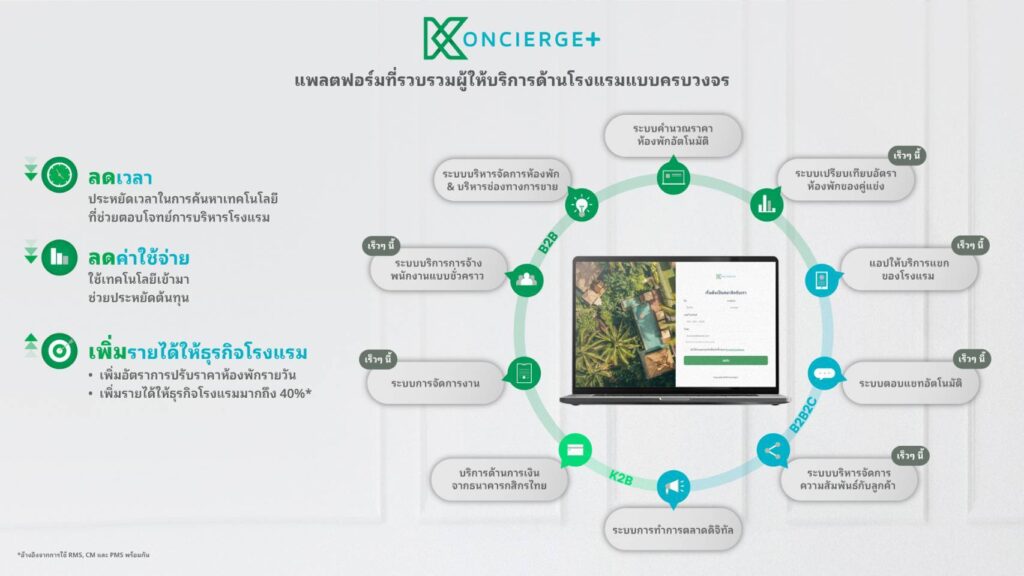 ล่าสุด เปิดตัว KONCIERGE+ เป็นแพลตฟอร์มแรกที่รวมโซลูชันเพื่อธุรกิจโรงแรมแบบครบวงจร ได้แก่ ระบบการบริหารจัดการห้องพัก ระบบการบริหารช่องทางการขายและการตั้งราคา ระบบการบริหารจัดการประสบการณ์ลูกค้า นอกจากนี้ ยังเป็นการเพิ่มศักยภาพในการแข่งขันรับโอกาสการเติบโตของธุรกิจท่องเที่ยวไทย แม้ว่าธุรกิจท่องเที่ยวโดยภาพรวมมีแนวโน้มเติบโต แต่ธุรกิจโรงแรมขนาด SME ยังเผชิญกับปัญหาในหลายด้าน ซึ่งธนาคารหวังว่าการนำเทคโนโลยีเข้ามาช่วยบริหารจัดการโรงแรมผ่าน KONCIERGE+ จะช่วยให้ธุรกิจ SME สามารถคว้าโอกาสทางธุรกิจได้เพิ่มมากขึ้น ลดต้นทุน เพิ่มรายได้ รวมถึงการสร้างกำไรที่เพิ่มขึ้น เพื่อการเติบโตอย่างมั่นคงและยั่งยืน โดยประเมินว่าสมาชิกสมาคมโรงแรมไทยทั้ง 1000 แห่งซึ่งเป็นผู้ประกอบการขนาดกลางและขนาดเล็ก เมื่อใช้แพลตฟอร์มจะช่วยสร้างมูลค่าได้ 400-500 ล้านบาท