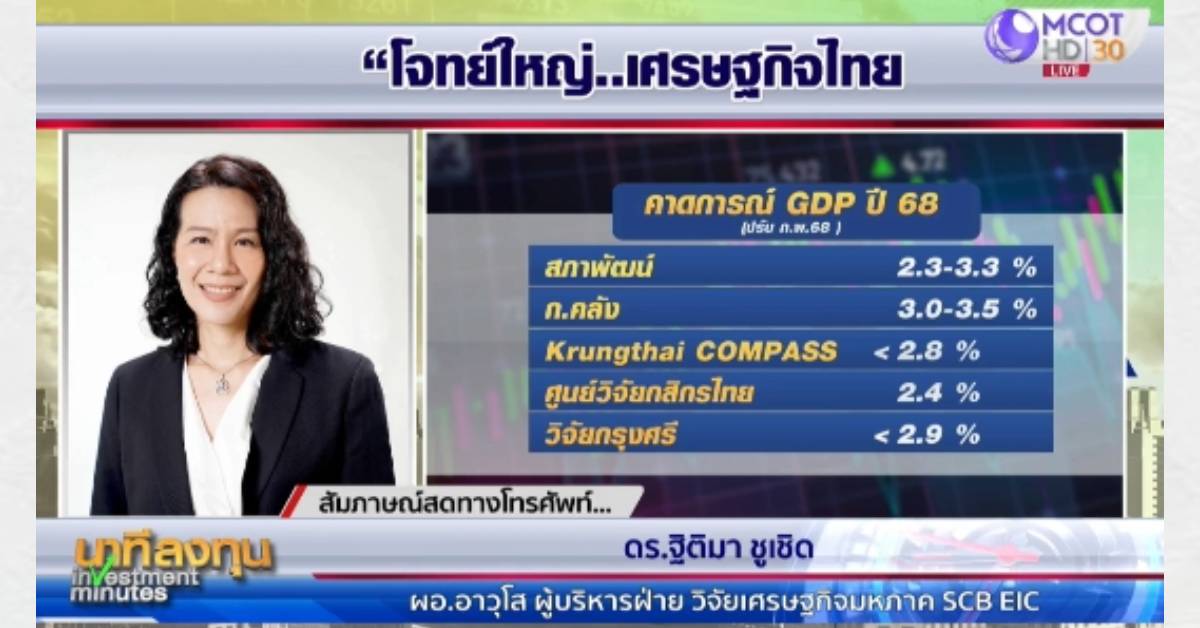 ดร.ฐิติมา กล่าวว่า SCB EIC อยู่ระหว่างทบทวนคาดการณ์จีดีพีไทยปี 68 ซึ่งคาดว่าจะชะลอลง มากกว่าปีที่ผ่านมาที่ สภาพัฒน์ประกาศจีดีพีปี 67 โต 2.5% โดยเศรษฐกิจไทยมีความเสี่ยงเพิ่มขึ้นนอกเหนือจากการขึ้นภาษีของสหรัฐแล้ว ก็จะเห็นได้ว่าบริโภคของไทยเปราะบาง โดยแม้ไตรมาส 4/67 แม้จะมีเงิน 1 หมื่นบาท ทยอยเข้าระบบ แต่ไม่เต็มเม็ดเต็มหน่วย สะท้อนความเปราะบางของการบริโภค บางส่วนนำไปออมเพื่ออนาคต บางส่วนนำใช้หนี้ เพราะหนี้ภาคครัวเรือนยังอยู่ในระดับสูง โดยภาพนี้จะยังคงส่งมาถึง/ไตรมาส 1 และ 2 ปีนี้ แม้จะมีเงิน 10,000 บาทเข้าเพิ่มเติมและมีการช้อปลดหย่อนภาษี EASY –E- Receipt ก็ตาม ในขณะที่ภาคการส่งออกปีนี้ก็จะชะลอตัวจากปีที่แล้ว โต 5% โดยปีที่แล้วรวมถึงไตรมาส 1/68 ส่งออกเร่งตัวเพราะหวั่นภาษีสหรัฐ ดังนั้น ในช่วงที่เหลือก็จะชะลอลง