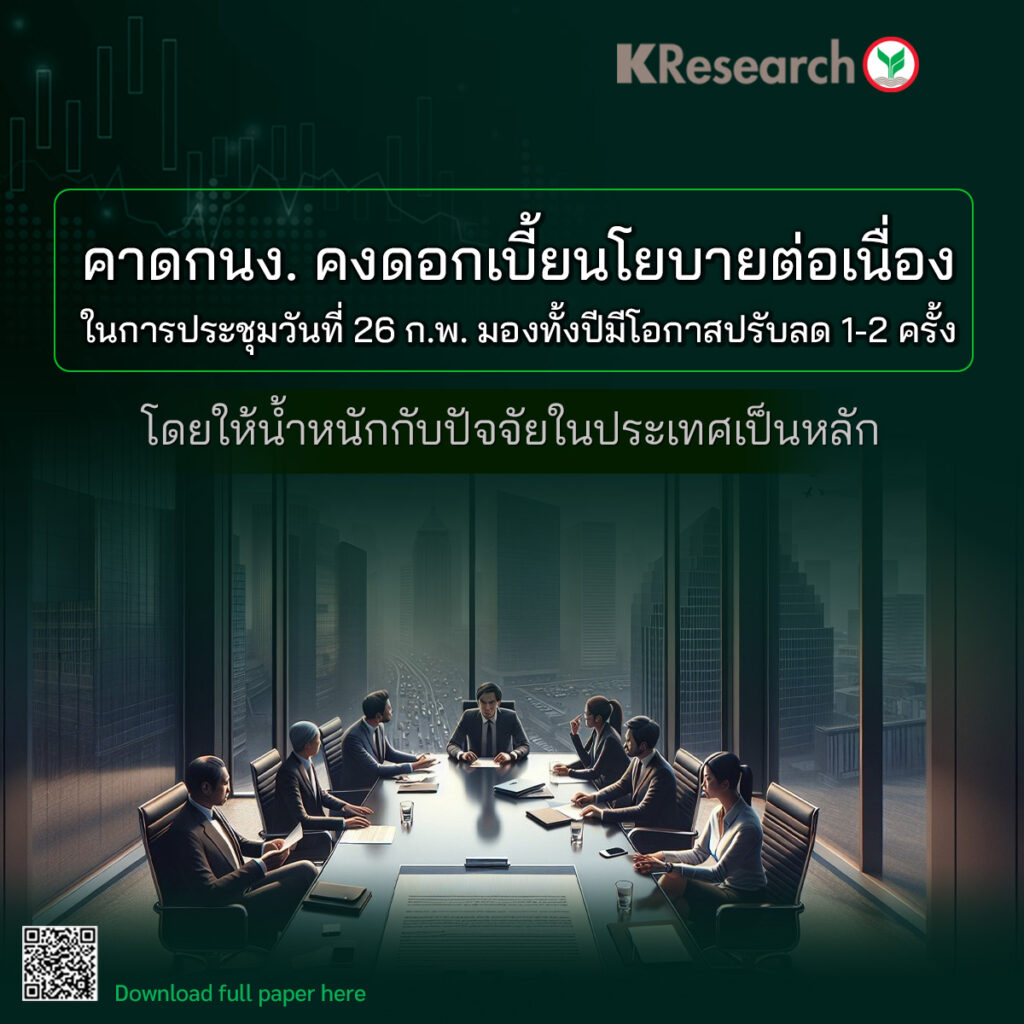 ด้านศูนย์วิจัยกสิกรไทย คาด กนง.คงดอกเบี้ยนโยบายต่อเนื่องในการประชุมวันที่ 26 ก.พ. มีแนวโน้มรอดูสถานการณ์เศรษฐกิจไทยภายใต้ความไม่แน่นอนที่มีอยู่สูงโดยเฉพาะอย่างยิ่งความเสี่ยงจากนโยบายปรับขึ้นภาษีนำเข้าของสหรัฐฯ คาด กนง. จะปรับลดดอกเบี้ยนโยบาย 1-2 ครั้ง โดย กนง. คงให้น้ำหนักกับความเสี่ยงด้านเศรษฐกิจและเสถียรภาพทางการเงินภายในประเทศเป็นสำคัญ