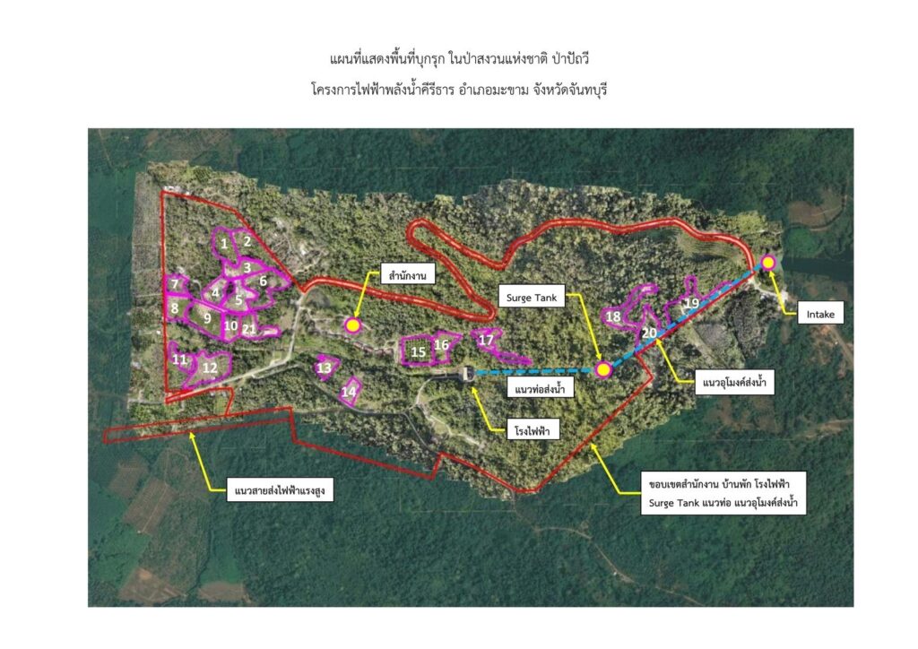 จากการตรวจสอบที่ผ่านมา พพ. พบว่ามีการบุกรุกพื้นที่เพื่อทำการเกษตรและปลูกพืชเศรษฐกิจในหลายจุด โดยบางส่วนอยู่ในเขตพื้นที่ป่าสงวนแห่งชาติและบางส่วนเป็นพื้นที่ ส.ป.ก. ที่ต้องได้รับการตรวจสอบสิทธิ์การครอบครอง โดย พพ. ได้ดำเนินการแจ้งพร้อมปักป้ายแจ้งเตือนให้ผู้บุกรุกออกจากพื้นที่โดยเร็ว และหากมีเอกสารสิทธิ์ที่ถูกต้องสามารถนำมายืนยันต่อหน่วยงานที่เกี่ยวข้องเพื่อพิจารณาต่อไป โดยล่าสุด พพ. ได้ดำเนินคดีผู้บุกรุกแล้ว 2 ราย และได้อยู่ระหว่างดำเนินการ แจ้งความดำเนินคดีอีก 15 ราย รวม 21 แปลงที่ดิน