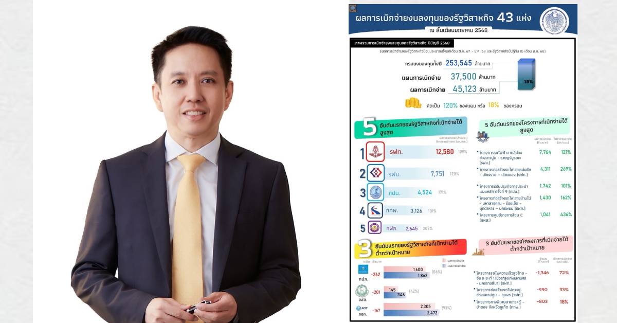 ประกอบด้วยการเบิกจ่ายงบลงทุนของรัฐวิสาหกิจปีงบประมาณ (ตั้งแต่เดือนตุลาคม 2567 – เดือนมกราคม 2568) 34 แห่ง จำนวน 36,490 ล้านบาท หรือคิดเป็นร้อยละ 109 ของแผนการเบิกจ่าย และรัฐวิสาหกิจปีปฏิทิน (เดือนมกราคม 2568) 9 แห่ง จำนวน 8,633 ล้านบาท หรือคิดเป็นร้อยละ 208 ของแผนการเบิกจ่าย ทั้งนี้ รัฐวิสาหกิจปีงบประมาณที่เบิกจ่ายได้ไม่ต่ำกว่าร้อยละ 95 ของแผนการเบิกจ่าย มีมูลค่าสูงสุด 3 อันดับแรก ได้แก่ การรถไฟแห่งประเทศไทย (รฟท.) การรถไฟฟ้าขนส่งมวลชนแห่งประเทศไทย (รฟม.) และการประปานครหลวง (กปน.)