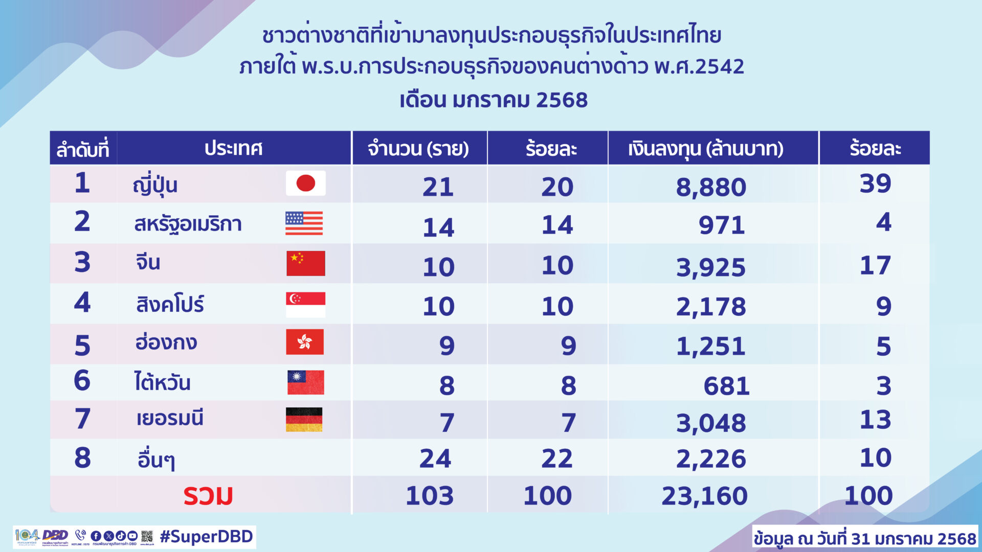 นางอรมน ทรัพย์ทวีธรรม อธิบดีกรมพัฒนาธุรกิจการค้า กระทรวงพาณิชย์ ในฐานะเลขานุการคณะกรรมการการประกอบธุรกิจของคนต่างด้าว พ.ศ.2542 เปิดเผยว่า เดือนมกราคม 2568 มีการอนุญาตให้คนต่างชาติเข้ามาลงทุนประกอบธุรกิจในประเทศไทย ภายใต้พระราชบัญญัติการประกอบธุรกิจของคนต่างด้าว พ.ศ. 2542 จำนวน 103 ราย โดยเป็นการลงทุนผ่านช่องทางการขอรับใบอนุญาตประกอบธุรกิจของคนต่างด้าว จำนวน 21 ราย และการขอหนังสือรับรองการประกอบธุรกิจของคนต่างด้าว (ผ่านช่องทางการลงทุนตามกฎหมายว่าด้วยการส่งเสริมการลงทุน หรือได้รับอนุญาตตามกฎหมายว่าด้วยการนิคมอุตสาหกรรมแห่งประเทศไทย และการใช้สิทธิตามสนธิสัญญาหรือความตกลงระหว่างประเทศ) จำนวน 82 ราย เงินลงทุนรวมทั้งสิ้น 23,160 ล้านบาท โดยชาวต่างชาติที่เข้ามาลงทุน 7 อันดับแรกของเดือนมกราคม 2568 ได้แก่