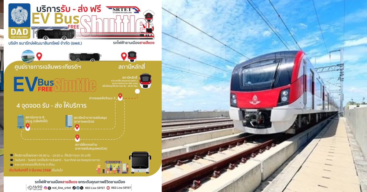 นายสุเทพ พันธุ์เพ็ง กรรมการผู้อำนวยการใหญ่ บริษัท รถไฟฟ้า ร.ฟ.ท. จำกัด หรือผู้ให้บริการรถไฟฟ้าชานเมืองสายสีแดง เปิดเผยว่า ด้วยอัตราการเติบโตของปริมาณผู้โดยสารรถไฟฟ้าชานเมืองสายสีแดงที่เพิ่มขึ้นอย่างต่อเนื่อง จากการดำเนินนโยบายอัตราค่าโดยสารรถไฟฟ้าสูงสุด 20 บาทตลอด ในปีแรก เมื่อเดือนตุลาคม 2566 ที่ผ่านมา จนถึงปี 2568 นั้น บริษัทฯ จึงวางแผนร่วมกับ บริษัท ธนารักษ์พัฒนาสินทรัพย์ จำกัด (ธพส.) เพื่อพัฒนาการเดินทางด้วยระบบขนส่งรอง หรือ Feeder ในการช่วยเพิ่มความสะดวกสบายด้านการเดินทางของประชาชน พร้อมทั้งส่งเสริมการใช้ระบบขนส่งมวลชนแทนการใช้รถยนต์ส่วนบุคคล ซึ่งจะช่วยลดปัญหาจราจรติดขัดและอุบัติเหตุบนท้องถนนและส่งเสริมการใช้ระบบขนส่งมวลชนเพื่อความยั่งยืน อีกทั้งยังช่วยลดมลพิษจากการเดินทางด้วย ดังนั้นจึงเกิดเป็นโครงการในการใช้รถขนส่งสาธารณะที่ใช้พลังงานจากแหล่งพลังงานไฟฟ้า หรือ EV Bus (Electric Bus) ในการขับเคลื่อนที่มีความเป็นมิตรกับสิ่งแวดล้อม โดยเตรียมทดลองให้บริการเชื่อมต่อระหว่างศูนย์ราชการเฉลิมพระเกียรติฯ และสถานีรถไฟฟ้าชานเมืองสายสีแดง(สถานีหลักสี่) ตั้งแต่วันจันทร์ที่ 3 มีนาคม 2568 นี้ โดยมีระยะทางประมาณ 4.5 กิโลเมตร พร้อมกับจุดรับ-ส่งจำนวน 4 จุด ได้แก่ 1. สถานีอาคาร B ประตู 2 (ฝั่งทิศใต้) 2. สถานีด้านหน้าอาคารสนับสนุน (อาคารพดด้วง) 3. สถานีปากซอยแจ้งวัฒนะ 5 และ 4. สถานีฝั่งตรงข้ามอาคารสนับสนุน (อาคารพดด้วง), โดยการให้บริการในช่วงทดลอง จะเป็นการเปิดให้บริการฟรี โดยไม่เสียค่าใช้จ่ายตลอดช่วงระยะเวลาการทดลอง ตั้งแต่เวลา 06.00 – 19.00 น. ในวันจันทร์-ศุกร์ โดยจะสิ้นสุดการทดลองให้บริการในวันที่ 31 สิงหาคม 2568 รวมระยะเวลาในการทดลองให้บริการทั้งสิ้น 6 เดือน