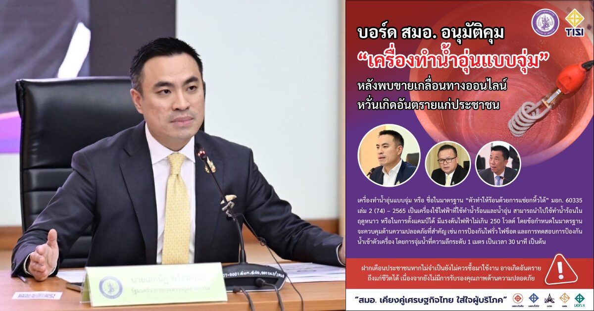 นายเอกนัฏ พร้อมพันธุ์ รัฐมนตรีว่าการกระทรวงอุตสาหกรรม เปิดเผยว่า กระทรวงอุตสาหกรรม ดำเนินงานตามนโยบาย “Save อุตสาหกรรมไทย” หนึ่งในการปฏิรูปอุตสาหกรรมสู่เศรษฐกิจยุคใหม่ เพื่อยกระดับการคุ้มครองความปลอดภัยของประชาชน โดยการควบคุมสินค้าที่เกี่ยวข้องกับความปลอดภัยในชีวิตและทรัพย์สินของประชาชน โดยเฉพาะสินค้าที่ส่งผลกระทบกับความปลอดภัยของประชาชนโดยตรง เช่น เครื่องใช้ไฟฟ้า เหล็ก วัสดุก่อสร้าง ลิฟต์ บันไดเลื่อน และถังดับเพลิง เป็นต้น เพื่อให้ สมอ. สามารถกำกับดูแลคุณภาพสินค้าให้เป็นไปตามมาตรฐานได้มากขึ้น ซึ่งในการประชุมบอร์ด สมอ. เมื่อวันที่ 18 กุมภาพันธ์ 2568 ที่ผ่านมา ได้เห็นชอบให้ “ตัวทำให้ร้อนด้วยการแช่ยกหิ้วได้” หรือที่รู้จักกันโดยทั่วไปคือ เครื่องทำน้ำอุ่นแบบจุ่ม เป็นสินค้าควบคุม เพื่อคุ้มครองความปลอดภัยของประชาชน หลังพบว่ามีการจำหน่ายอย่างแพร่หลายบนแพลตฟอร์มออนไลน์ชื่อดัง หวั่นประชาชนนำไปใช้อาจเกิดอันตรายถึงแก่ชีวิตได้