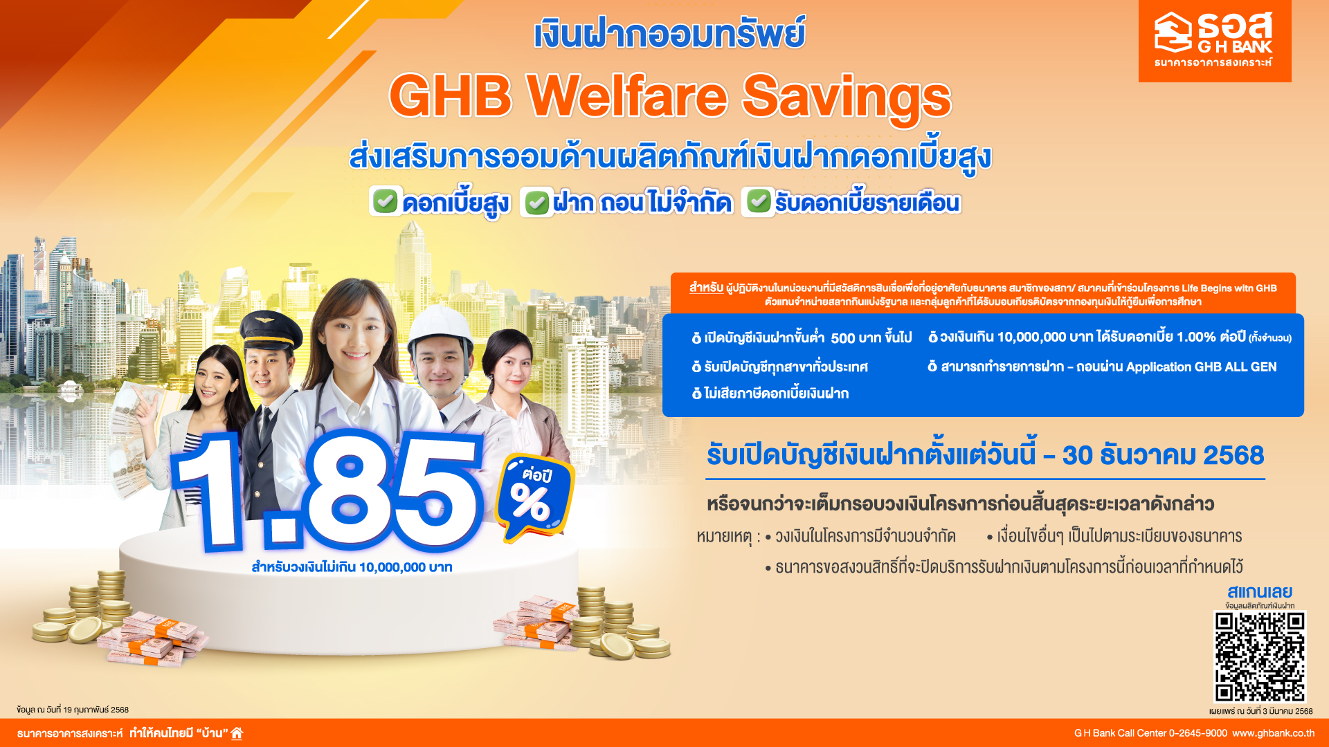 ธนาคารอาคารสงเคราะห์ (ธอส.) จัดทำผลิตภัณฑ์ทางการเงินที่ให้ผลตอบแทนสูง เอาใจคนรักการออม สำหรับผู้ปฏิบัติงานในหน่วยงานที่เข้าร่วมโครงการสวัสดิการสินเชื่อเพื่อที่อยู่อาศัยกับ ธอส. หรือสมาชิกของสภา/สมาคมวิชาชีพที่เข้าร่วมโครงการ Life Begins with GHB, ตัวแทนจำหน่ายสลากกินแบ่งรัฐบาล และกลุ่มลูกค้าที่ได้รับมอบเกียรติบัตรจากกองทุนให้กู้ยืมเพื่อการศึกษากับ “เงินฝากออมทรัพย์ GHB Welfare Savings” ที่ให้อัตราดอกเบี้ยถึง 1.85% ต่อปี (สำหรับผู้ที่มีวงเงินฝากคงเหลือไม่เกิน 10 ล้านบาท) เพียงเปิดบัญชีขั้นต่ำ 500 บาทขึ้นไป ณ สาขาธนาคารทั่วประเทศ ตั้งแต่วันนี้ถึงวันที่ 30 ธันวาคม 2568 หรือจนกว่าจะเต็มกรอบวงเงินโครงการก่อนสิ้นสุดระยะเวลาดังกล่าว โดยลูกค้าจะได้รับดอกเบี้ยรายเดือน และสำหรับลูกค้าบุคคลธรรมดาได้รับการยกเว้นภาษีดอกเบี้ยเงินฝาก