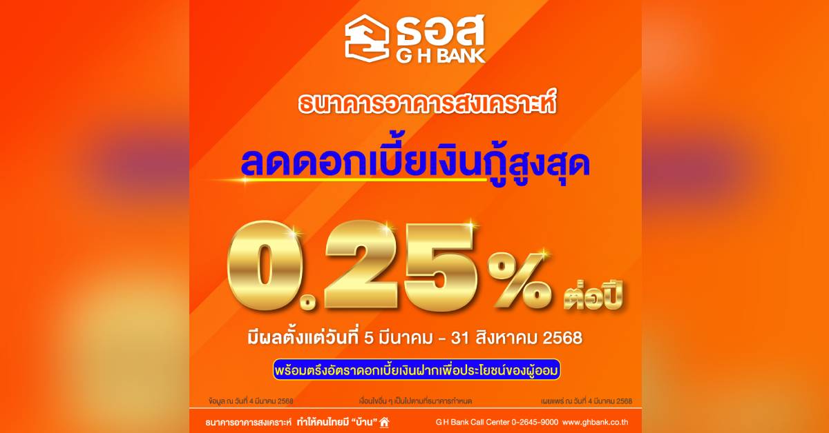กรุงเทพฯ 4 มี.ค. – ธอส. ประกาศลดอัตราดอกเบี้ยเงินกู้สูงสุด 0.25% ต่อปี ช่วยกระตุ้นภาคอสังหาริมทรัพย์ พร้อมตรึงอัตราดอกเบี้ยเงินฝาก เพื่อประโยชน์ของผู้ออม มีผลตั้งแต่วันที่ 5 มีนาคม – 31 สิงหาคม 2568