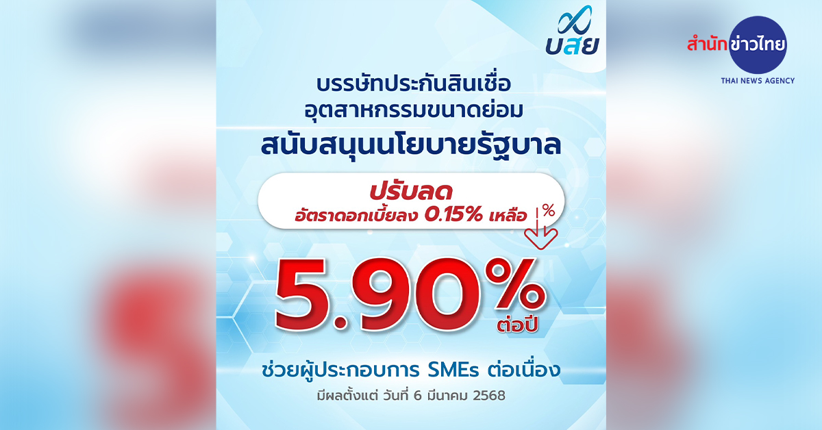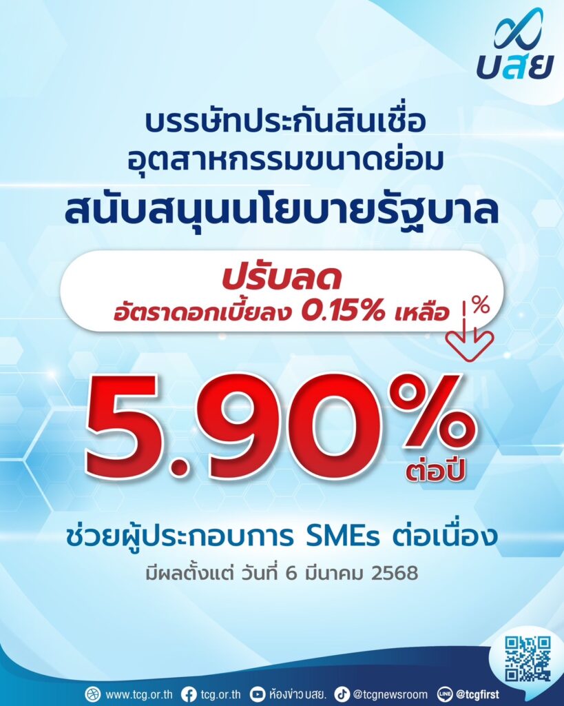 นายสิทธิกร ดิเรกสุนทร กรรมการและผู้จัดการทั่วไป บรรษัทประกันสินเชื่ออุตสาหกรรมขนาดย่อม (บสย.) กล่าวว่า บสย. สนับสนุนนโยบายรัฐบาล ประกาศปรับลดอัตราดอกเบี้ย Prime Rate ลง 0.15% ต่อปี คงเหลือ 5.90% ต่อปี ซึ่งเป็นอัตราดอกเบี้ยที่ต่ำที่สุด เพื่อช่วยเหลือผู้ประกอบการ SMEs ต่อเนื่อง โดยให้มีผลตั้งแต่วันที่ 6 มีนาคม 2568 เป็นต้นไป