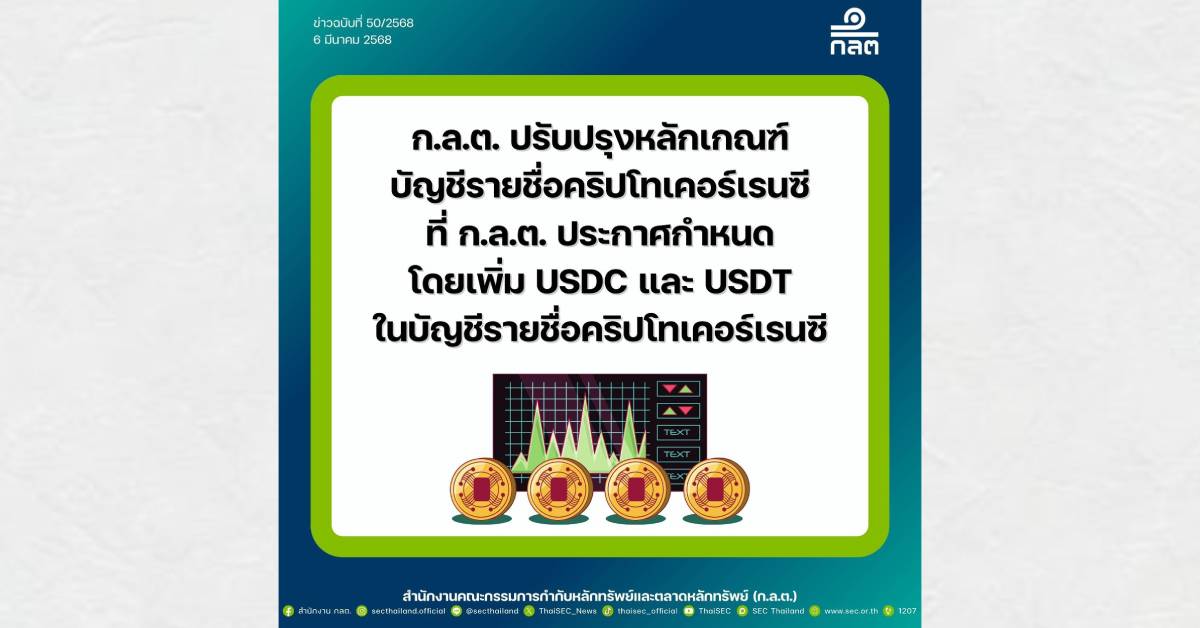 สำนักงานคณะกรรมการกำกับหลักทรัพย์และตลาดหลักทรัพย์ (ก.ล.ต.) ปรับปรุงหลักเกณฑ์บัญชีรายชื่อคริปโทเคอร์เรนซีที่ ก.ล.ต. ประกาศกำหนด เพื่อให้ผู้ออกเสนอขายโทเคนดิจิทัล (Issuer) รับคริปโทเคอร์เรนซีเป็นการตอบแทน และผู้ให้บริการระบบเสนอขายโทเคนดิจิทัล (ICO Portal) รับคริปโทเคอร์เรนซีจากผู้ลงทุนหรือ Issuer ในการทำธุรกรรม และเพื่อให้ศูนย์ซื้อขายสินทรัพย์ดิจิทัลซื้อขายหรือแลกเปลี่ยนสินทรัพย์ดิจิทัลกับคริปโทเคอร์เรนซีได้เพิ่มเติมอีก 2 สกุล ได้แก่ USD Coin (USDC) และ Tether (USDT) โดยมีผลใช้บังคับตั้งแต่วันที่ 16 มีนาคม 2568 เป็นต้นไป