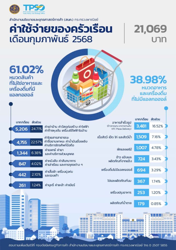 สำหรับรายละเอียด อัตราเงินเฟ้อทั่วไป เดือน ก.พ.ที่สูงขึ้นร้อยละ 1.08 (YoY) อัตราเงินเฟ้อพื้นฐาน (อัตราเงินเฟ้อทั่วไป เมื่อหักอาหารสดและพลังงานออก) สูงขึ้นร้อยละ 0.99 (YoY) เร่งตัวขึ้นจากเดือนมกราคม 2568 ที่สูงขึ้นร้อยละ 0.83 (YoY) ดัชนีราคาผู้บริโภคทั่วไปเดือนกุมภาพันธ์ 2568 เมื่อเทียบกับเดือนมกราคม 2568 ลดลงร้อยละ 0.02 (MoM) โดยมีการเคลื่อนไหวของราคาสินค้าและบริการ ดังนี้ หมวดอาหารและเครื่องดื่มไม่มีแอลกอฮอล์ สูงขึ้นร้อยละ 2.03 (YoY) จากการสูงขึ้นของราคาสินค้าสำคัญ กลุ่มผลไม้สด (กล้วยน้ำว้า ฝรั่ง แตงโม สับปะรด) กลุ่มอาหารสำเร็จรูป (ข้าวราดแกง กับข้าวสำเร็จรูป ก๋วยเตี๋ยว) กลุ่มเครื่องดื่มไม่มีแอลกอฮอล์ (กาแฟผงสำเร็จรูป น้ำอัดลม กาแฟ (ร้อน/เย็น)) กลุ่มเนื้อสัตว์ เป็ดไก่ และสัตว์น้ำ (ปลานิล กุ้งขาว เนื้อสุกร ปลาทูนึ่ง ปลาหมึกกล้วย ปลาทู) กลุ่มเครื่องประกอบอาหาร (น้ำมันพืช มะพร้าว (ผลแห้ง/ขูด) น้ำพริกแกง กะทิสำเร็จรูป) กลุ่มข้าว แป้ง และผลิตภัณฑ์จากแป้ง (ข้าวสารเจ้า ข้าวสารเหนียว ขนมอบ) กลุ่มผลิตภัณฑ์น้ำตาล (ขนมหวาน น้ำตาลทราย) และกลุ่มไข่และผลิตภัณฑ์นม (นมสด ไข่เป็ด) อย่างไรก็ตาม มีสินค้าหลายรายการที่ราคาลดลง อาทิ ผักสดบางชนิด (มะนาว พริกสด ผักคะน้า มะเขือ ผักชี ผักกาดขาว) ผลไม้บางชนิด (องุ่น แก้วมังกร) ไก่ย่าง/ไก่ทอด และซีอิ๊ว เป็นต้น