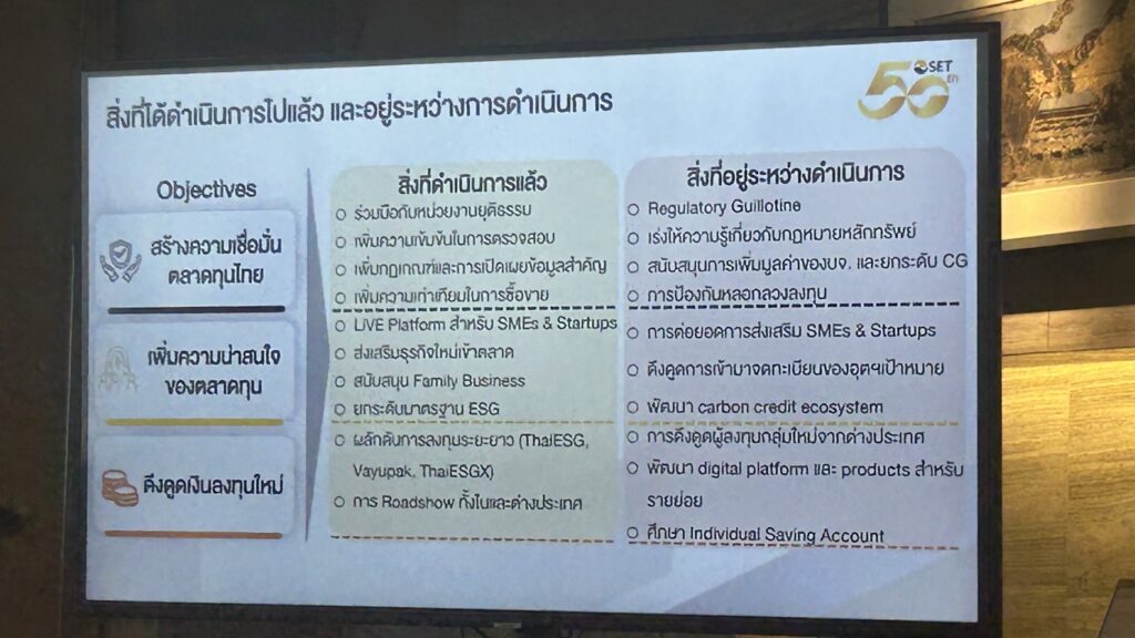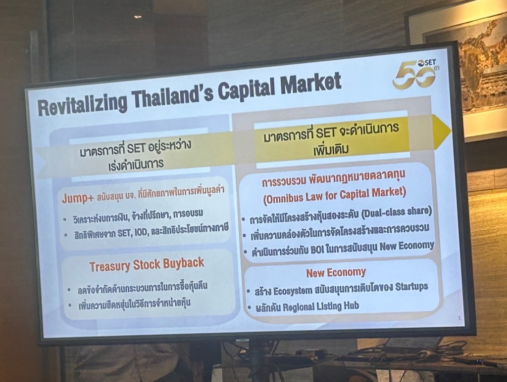 ศาสตราจารย์พิเศษกิติพงศ์ อุรพีพัฒนพงศ์ ประธานตลาดหลักทรัพย์แห่งประเทศไทย (ตลท.) กล่าวว่า ขณะนี้ตลาดทุนมีปัญหาทั่วโลก ไม่เฉพาะตลาดทุนไทย ซึ่งเกิดจากปัญหาจีโอโพลิติกส์ เศรษฐกิจโลก รวมถึงเศรษฐกิจในประเทศที่ไม่ได้เติบโต ตลากหลักทรัพย์ฯ ไม่ได้นิ่งนอนใจ เร่งสร้างออกมาตรการสร้างความเชื่อมั่น และฟื้นฟูตลาดทุนไทยอย่างต่อเนื่อง รวมถึงสร้างโอกาสใหม่ๆ เพื่อที่จะนำบริษัทจดทะเบียนที่มีอยู่ให้มีผลประกอบการดีขึ้น โดยมาตรการใหม่ๆ ที่อยู่ระหว่างเร่งดำเนินการ เช่น โครงการ Jump+ สนับสนุน บริษัทจดที่มีศักยภาพในการเพิ่มมูลค่า โดยการเอาบริษัทจดทะเบียนที่มีมูลค่าต่ำกว่าราคาที่ควรจะเป็นมาสร้างมูลค่าสูงขึ้น และจะได้รับสิทธิพิเศษจาก SET, IOD, และสิทธิประโยชน์ทางภาษี / โครงการ Treasury Stock Buyback ปลดล็อกเงื่อนไขซื้อหุ้นคืน และเพิ่มความยืดหยุ่นในการจำหน่ายหุ้น และนอกจากนี้ตลาดหลักทรัพย์ฯ ยังมีมาตรการที่จะดำเนินการเพิ่มเติมคือ การรวมรวม พัฒนากฏหมายตลาดทุน (Omnibus Law for Capital Market) โดยจะมีการจัดให้มีโครงสร้างหุ้นสองระดับ (Dual-class share) การเพิ่มความคล่องตัวในการจัดโครงสร้างและการควบรวม รวมถึงร่วมกับบีโอไอ สนับสนุน New Economy เช่น ธุรกิจเฮลท์แคร์ ธุรกิจเทคโนโลยีต่างๆ ทั้งบริษัทที่มีในปัจจุบันและบริษัทต่างประเทศ เมื่อมาลงทุนแล้วก็สร้างกลไกของหุ้น เพื่อให้เห็นว่ามาลงทุนแล้วได้ประโยชน์ไม่สูญเสียอำนาจ ซึ่งในส่วนของ New Economy ก็จะมีการสร้าง Ecosystem สนับสนุนการเติบโตของ Startups รวมถึงผลักดัน Reglonal Listing Hub