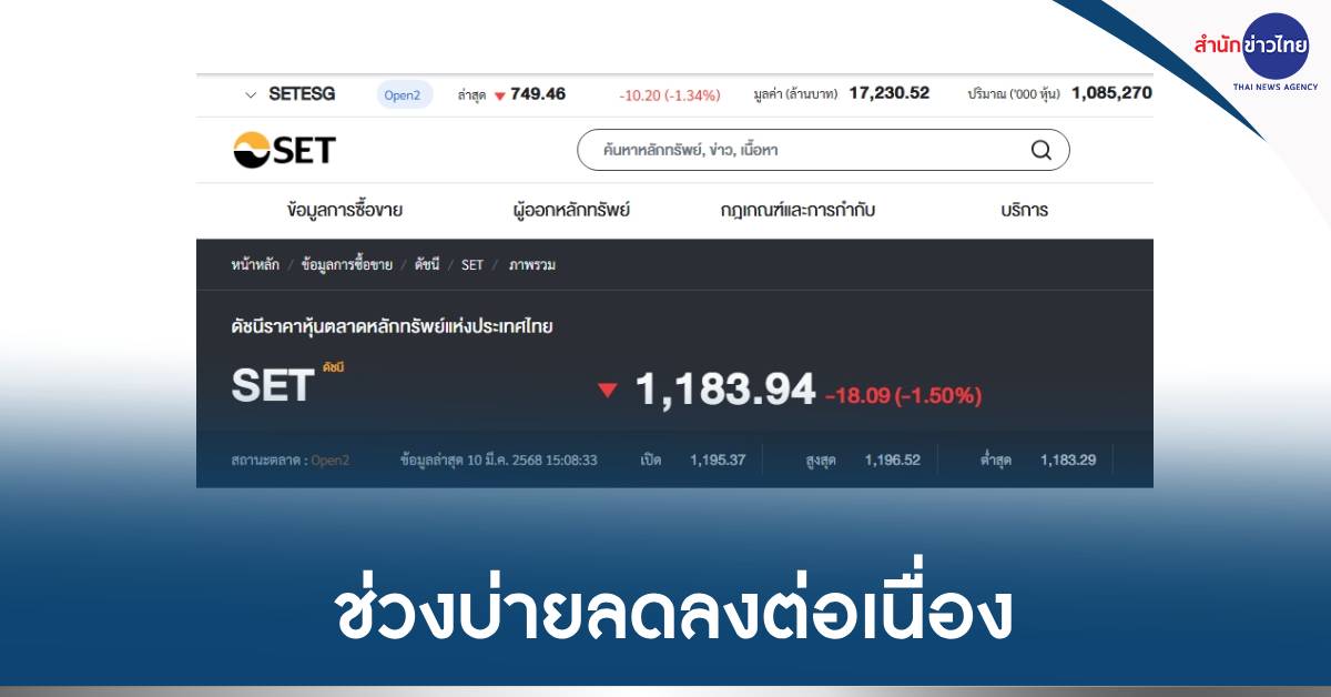 เมื่อเวลา 15.08 น.หุ้นไทยยังร่วงต่อเนื่อง 18 จุด ดัชนี SET อยู่ที่ประมาณ 1,183 จุด ร่วงแรงเป็นอันดับ 2 ของภูมิภาครองจากตลาดหุ้นฮ่องกง ถูกกดดันจาก Sentiment ต่างประเทศ ทั้งรายงานตัวเลขเศรษฐกิจสหรัฐอ่อนแอกว่าคาด รายงานตัวเลขดัชนีผู้บริโภค (CPI) หรือเงินเฟ้อของจีนติดลบเป็นครั้งแรกในรอบ 13 เดือน ส่วนในประเทศ ตลาดได้รับแรงกดดันจาก DELTA ที่ปรับตัวลงแรง แม้ที่ประชุมคณะกรรมการนโยบายโครงการกระตุ้นเศรษฐกิจ ครั้งที่ 1/2568 ที่มี น.ส.แพทองธาร ชินวัตร นายกรัฐมนตรีรัฐมนตรี (ครม.)เห็นชอบหลักการแจกเงินดิจิทัลวอลเล็ต 10,000 บาทเฟส 3 ให้กับประชาชนวัย 16-20 ปี ก็ตาม