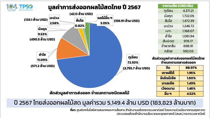 นายพูนพงษ์ นัยนาภากรณ์ ผู้อำนวยการสำนักงานนโยบายและยุทธศาสตร์การค้า (สนค.) โฆษกกระทรวงพาณิชย์ กล่าวว่า ในปี 2567 ผลไม้เป็นสินค้าเกษตรส่งออกอันดับ 1 ของไทย มีการส่งออกผลไม้ ทั้งแบบสด แช่เย็น แช่แข็ง และแห้ง รวมมูลค่า 6,510.6 ล้านเหรียญสหรัฐ (231,401 ล้านบาท) สูงกว่ามูลค่าการส่งออกเฉลี่ยในช่วง 5 ปีที่ผ่านมา (5,855.7 ล้านเหรียญสหรัฐ) คิดเป็นสัดส่วน 22.6% ของมูลค่าการส่งออกสินค้าเกษตรทั้งหมดของไทย เฉพาะ การส่งออกผลไม้สด มีมูลค่า 5,149.4 ล้านเหรียญสหรัฐ (183,823 ล้านบาท) โดยไทยมีผลไม้สดที่เป็นสินค้าส่งออกสำคัญหลายชนิด เช่น ทุเรียน มีปริมาณการส่งออก 859,183 ตัน มูลค่า 3,755.7 ล้านเหรียญสหรัฐ (134,852 ล้านบาท) มีสัดส่วนถึง 72.9% ของมูลค่าการส่งออกผลไม้สดทั้งหมดของไทย ตลาดส่งออกสำคัญ 5 อันดับแรก ได้แก่ (1) จีน (สัดส่วน 97.4% ของมูลค่าการส่งออกทุเรียนสดของไทย) (2) ฮ่องกง (1.3%) (3) เกาหลีใต้ (0.3%) (4) มาเลเซีย (0.2%) และ (5) สหรัฐอเมริกา (0.2%)