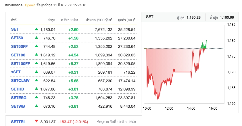 หุ้นไทยช่วงบ่ายเป็นบวก โดยเวลา 15.24 น. SET อยู่ที่ 1,180 จุด บวก 2.60 จุด จากช่วงปิดซื้อขายช่วงเช้าลดลงกว่า 4 จุด และระหว่างซื้อขายช่วงเช้าทำสถิติต่ำสุดในรอบ 6 ปี