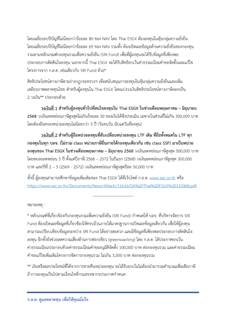 ทั้งนี้ เพื่อให้สอดรับกับแนวนโยบายของภาครัฐ ก.ต.ท. มีมติเห็นชอบหลักการให้ Thai ESGX ลงทุนในทรัพย์สินที่ผู้ออกเป็นภาครัฐไทยหรือกิจการที่จัดตั้งขึ้นตามกฎหมายไทย ที่มีคุณสมบัติด้านความยั่งยืนตามหลักเกณฑ์เดียวกับกองทุนรวมไทยเพื่อความยั่งยืน (Thai ESG) ที่ต้องลงทุนในผลิตภัณฑ์กลุ่มความยั่งยืนโดยเฉลี่ยรอบปีบัญชีไม่น้อยกว่าร้อยละ 80 ของ NAV โดย Thai ESGX ต้องลงทุนในหุ้นกลุ่มความยั่งยืนโดยเฉลี่ยรอบปีบัญชีไม่น้อยกว่าร้อยละ 65 ของ NAV รวมทั้ง ต้องเปิดเผยข้อมูลด้านความยั่งยืนของกองทุนรวมตามหลักเกณฑ์กองทุนรวมเพื่อความยั่งยืน (SRI Fund) เพื่อที่ผู้ลงทุนจะได้รับข้อมูลที่เพียงพอประกอบการตัดสินใจลงทุน นอกจากนี้ Thai ESGX จะได้รับสิทธิยกเว้นค่าธรรมเนียมคำขอจัดตั้งและแก้ไขโครงการจาก ก.ล.ต. เช่นเดียวกับ SRI Fund ด้วย*