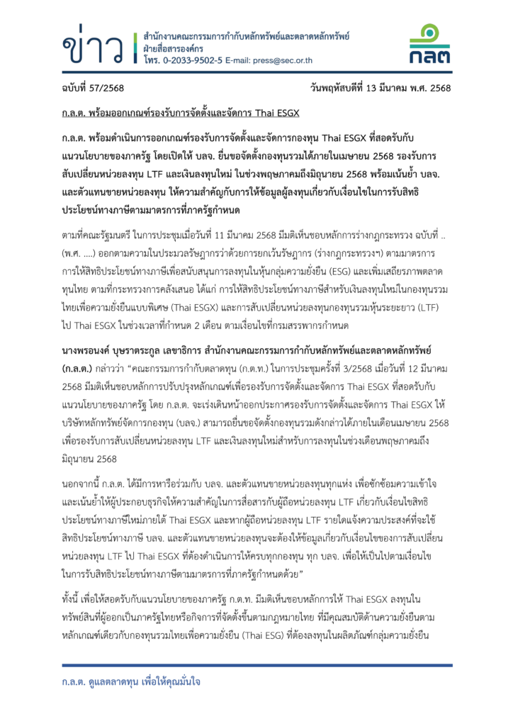 นางพรอนงค์ บุษราตระกูล เลขาธิการ สำนักงานคณะกรรมการกำกับหลักทรัพย์และตลาดหลักทรัพย์ (ก.ล.ต.) กล่าวว่าคณะกรรมการกำกับตลาดทุน (ก.ต.ท.) ในการประชุมครั้งที่ 3/2568 เมื่อวันที่ 12 มีนาคม 2568 มีมติเห็นชอบหลักการปรับปรุงหลักเกณฑ์เพื่อรองรับการจัดตั้งและจัดการ Thai ESGX ที่สอดรับกับแนวนโยบายของภาครัฐ โดย ก.ล.ต. จะเร่งเดินหน้าออกประกาศรองรับการจัดตั้งและจัดการ Thai ESGX ให้บริษัทหลักทรัพย์จัดการกองทุน (บลจ.) สามารถยื่นขอจัดตั้งกองทุนรวมดังกล่าวได้ภายในเดือนเมษายน 2568 เพื่อรองรับการสับเปลี่ยนหน่วยลงทุน LTF และเงินลงทุนใหม่สำหรับการลงทุนในช่วงเดือนพฤษภาคมถึงมิถุนายน 2568