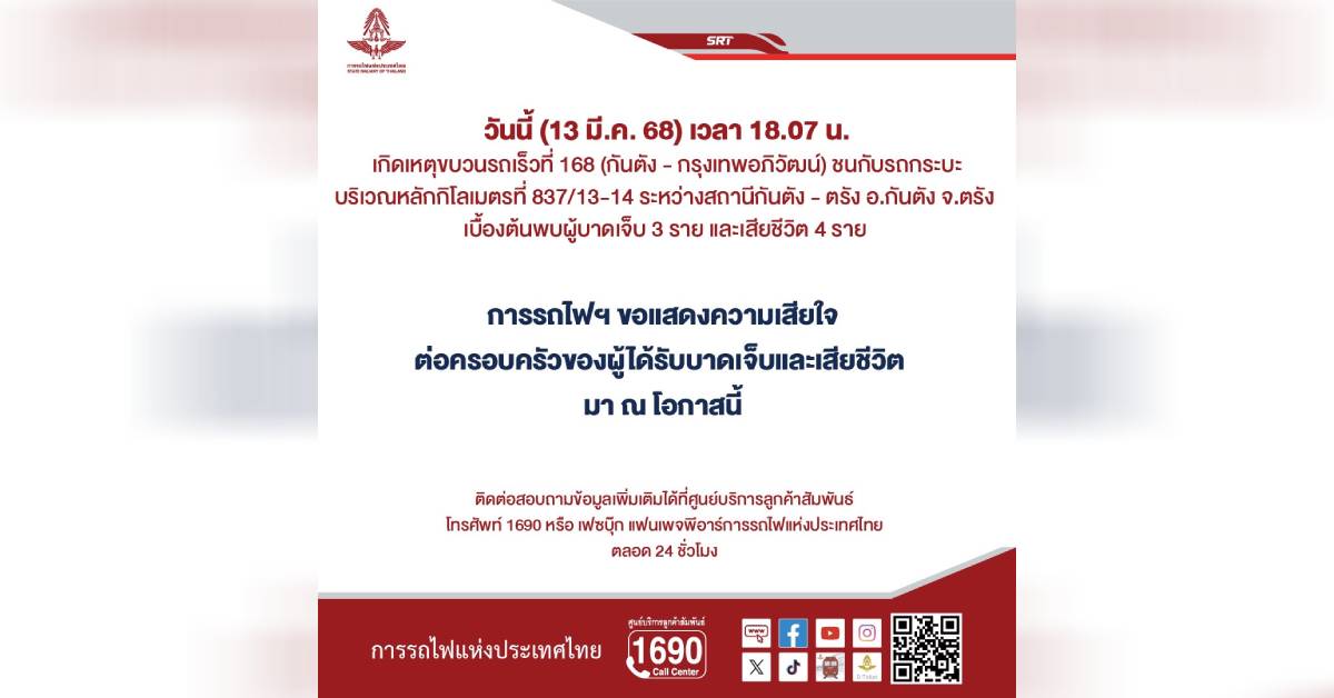 นายวีริศ อัมระปาล ผู้ว่าการรถไฟแห่งประเทศไทย (รฟท.) เปิดเผยว่า วันนี้ (13 มีนาคม 2568) เวลา 14.49 น. การรถไฟฯ ได้รับรายงานเหตุขบวนรถเร็วที่ 168 กันตัง – กรุงเทพอภิวัฒน์ ชนกับรถกระบะบริเวณหลักกิโลเมตรที่ 837/13-14 ระหว่างสถานีกันตัง – ตรัง อ.กันตัง จ.ตรัง เบื้องต้นพบผู้บาดเจ็บ 3 ราย และเสียชีวิต 4 ราย ทั้งนี้ การรถไฟฯ ขอแสดงความเสียใจกับครอบครัวของผู้เสียชีวิต อย่างไรก็ตาม จากการตรวจสอบจุดที่เกิดอุบัติเหตุพบว่า เป็นทางลักผ่านที่ผิดกฎหมาย และไม่ได้รับอนุญาตจากการรถไฟฯ แต่เพื่อความปลอดภัย จึงได้ติดตั้งสัญญาณเตือน ป้ายจราจร ไฟกะพริบป้ายข้อความเตือนทั้งสองด้าน พร้อมทั้งมีเครื่องหมายจราจรครบถ้วน เพื่อเพิ่มความปลอดภัยให้กับผู้ใช้รถใช้ถนน