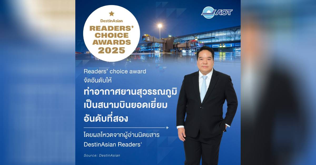บริษัท ท่าอากาศยานไทย จำกัด (มหาชน) (AOT) โดยท่าอากาศยานสุวรรณภูมิ (Suvarnabhumi Airport) ได้รับการจัดอันดับให้เป็นสนามบินยอดเยี่ยมอันดับ 2 จากการประกาศผลรางวัล DestinAsian Readers’ Choice Awards 2025 ซึ่งเป็นรางวัลที่มาจากการลงคะแนนของผู้อ่านนิตยสาร DestinAsian นิตยสารท่องเที่ยวชั้นนำ