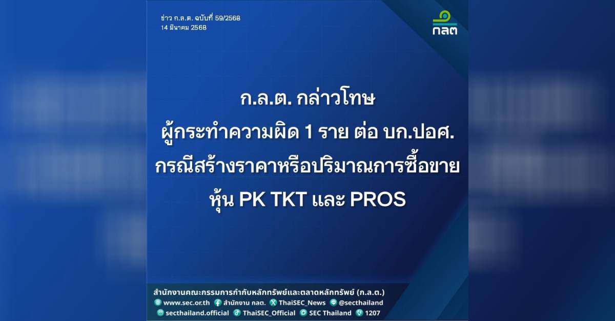 กรุงเทพฯ 14 มี.ค.- ก.ล.ต. กล่าวโทษ “จักรชัย สกุลเอกไพศาล” ต่อ บก.ปอศ. กรณีสร้างราคาหรือปริมาณการซื้อขายหุ้น PK, TKT และ PROS พร้อมแจ้ง ปปง.ดำเนินการ