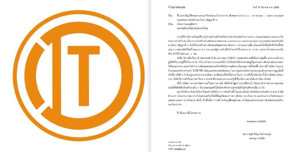 บริษัท อิตาเลียนไทย ดีเวล๊อปเมนต์ จำกัด (มหาชน) (“บริษัทฯ”) ขอแสดงความเสียใจอย่างสุดซึ้งต่อครอบครัวของผู้เสียชีวิตและผู้ที่ได้รับบาดเจ็บ ทั้งทางด้านร่างกายและจิตใจ อีกทั้งยังทำให้ประชาชนผู้สัญจรบนทางพิเศษเฉลิมมหานครได้รับผลกระทบ และทำให้การทางพิเศษแห่งประเทศไทย ได้รับความเสียหายในเหตุการณ์ที่เกิดขึ้น ในการนี้บริษัทฯ ในฐานะตัวแทนของกิจการร่วมค้า ไอทีดี-วีซีบี พร้อมแสดงความรับผิดชอบ ในการดูแลจ่ายเงินค่าชดเชยและเยียวยาต่อการสูญเสียที่เกิดขึ้น บริษัทฯ กำลังอยู่ระหว่างการประเมินความเสียหายที่เกิดขึ้นร่วมกับทุกๆ ฝ่ายที่เกี่ยวข้องในครั้งนี้ เช่น เจ้าของงาน บริษัทวิศวกรที่ปรึกษา สภาวิศวกร เจ้าหน้าที่จากหน่วยงานภาครัฐที่เกี่ยวข้อง และบริษัทประกันฯ เป็นต้น