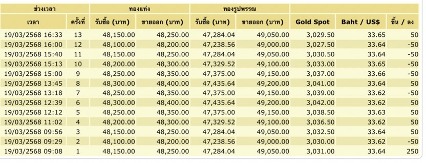 เว็บไซต์ของสมาคมค้าทองคำ ปรับราคาทั้งหมด 13 รอบ พุ่งขึ้น 250 บาท เปรียบเทียบกับราคาปิดเมื่อวานนี้ โดยราคาทองรูปพรรณขยับมาอยู่ที่บาทละ 49,050 บาท ทองคำแท่ง 48,250 บาท. -517-สำนักข่าวไทย