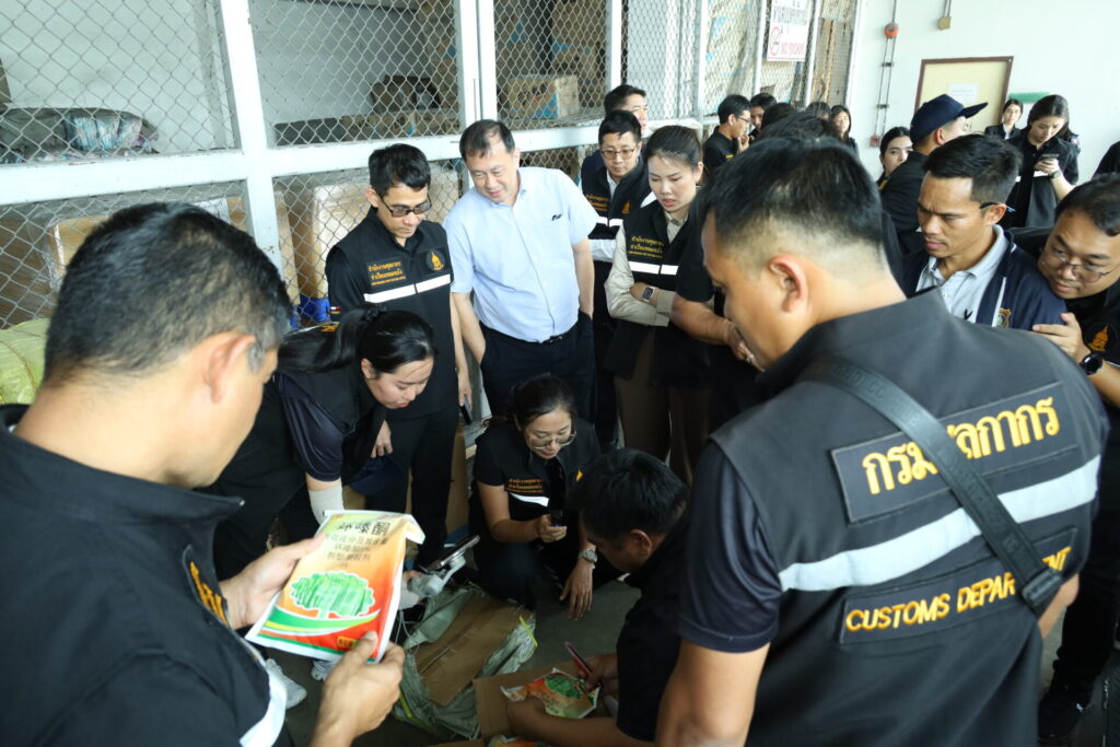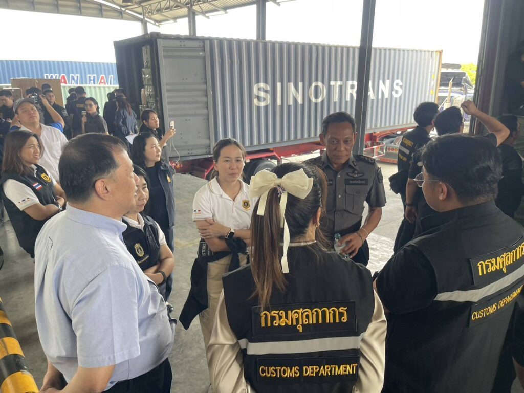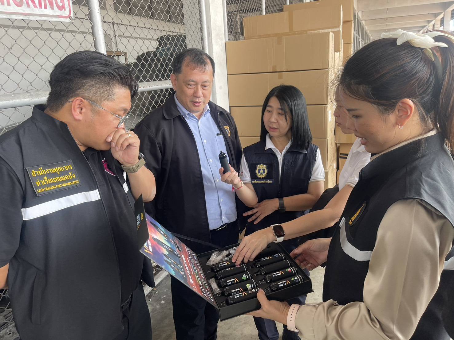 โดยวันนี้กรมศุลกากร ร่วมกับกรมสอบสวนคดีพิเศษ สำนักงานตำรวจแห่งชาติ สถานีตำรวจภูธรแหลมฉบัง และตำรวจภูธรภาค 2 ร่วมกับหน่วยงานที่เกี่ยวข้อง เข้าตรวจสอบตู้สินค้าตกค้าง จำนวน 8 ตู้คอนเทนเนอร์ ณ สำนักงานศุลกากรท่าเรือแหลมฉบัง จังหวัดชลบุรี พบมีการซุกซ่อนบุหรี่ไฟฟ้าปะปนมากับสินค้าอื่น มีรายละเอียดดังนี้ บุหรี่ไฟฟ้าชนิดใช้แล้วทิ้ง จำนวน 249 กล่อง (รวม 51,390 ชิ้น) มูลค่า 9,250,200 บาท เครื่องบุหรี่ไฟฟ้า จำนวน 6 กล่อง (รวม 2,307 ชิ้น) มูลค่า 2,153,500 บาท อุปกรณ์บุหรี่ไฟฟ้า จำนวน 2 กล่อง (รวม 2,350 ชิ้น) มูลค่า 117,500 บาท หัวน้ำยาบุหรี่ไฟฟ้า จำนวน 13 กล่อง (รวม 7,350 ชิ้น) มูลค่า 1,102,500 บาท จำนวนรวม 64,397 ชิ้น มูลค่ารวม 12,623,700 บาท