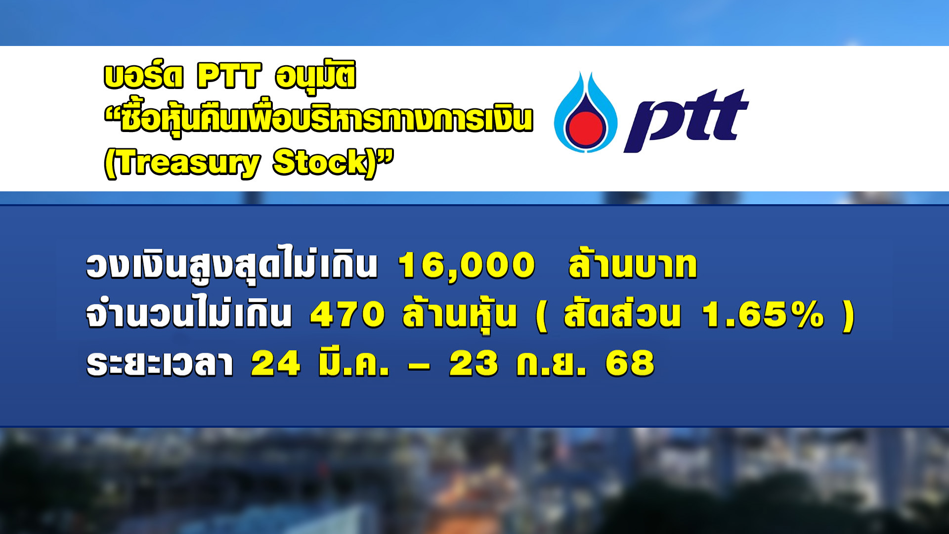 21 มี.ค. – นายคงกระพัน อินทรแจ้ง ประธานเจ้าหน้าที่บริหารและกรรมการผู้จัดการใหญ บริษัท ปตท. จำกัด (มหาชน) หรือ PTT แจ้งตลาดหลักทรัพย์แห่งประเทศไทย (ตลท.) ว่า ที่ประชุมคณะกรรมการ ปตท. วานนี้ มีมติอนุมัติโครงการซื้อหุ้นคืนเพื่อบริหารทางการเงิน (Treasury Stock) ภายในวงเงินสูงสุดไม่เกิน 16,000 ล้านบาท จำนวนหุ้นที่จะซื้อคืนไม่เกิน 470 ล้านหุ้น หรือไม่เกินร้อยละ 1.65 ของหุ้นที่จำหน่ายได้แล้วทั้งหมด โดยวิธีจับคู่อัตโนมัติผ่านระบบการซื้อขายของ ตลท. (Automatic Order Matching: AOM) มีกำหนดเวลาซื้อหุ้นคืนไม่เกิน 6 เดือน ตั้งแต่วันที่ 24 มีนาคม 2568 ถึงวันที่ 23 กันยายน 2568