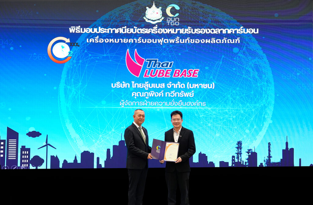 เมื่อเร็วๆ นี้ บริษัท ไทยลู้บเบส จำกัด (มหาชน) (TLB) บริษัทในกลุ่มไทยออยล์ รับมอบประกาศนียบัตรเครื่องหมายรับรองคาร์บอนฟุตพริ้นท์ของผลิตภัณฑ์ (Carbon Footprint of Product : CFP) ในพิธีมอบประกาศนียบัตรเครื่องหมายรับรองฉลากคาร์บอน ประจำปี 2568 ซึ่งจัดโดยองค์การบริหารจัดการก๊าซเรือนกระจก (องค์กรมหาชน) โดยมีนายเฉลิมชัย ศรีอ่อน รัฐมนตรีว่าการกระทรวงทรัพยากรธรรมชาติและสิ่งแวดล้อม เป็นผู้มอบเกียรติบัตร