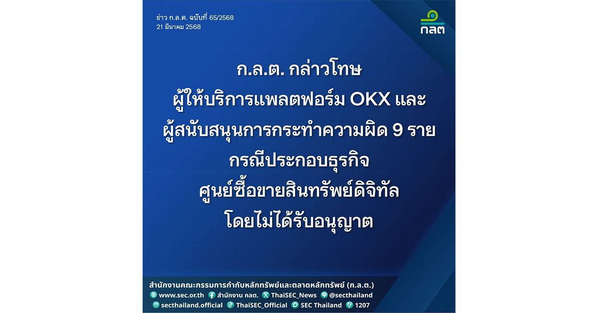 ก.ล.ต. จึงกล่าวโทษ OKX และผู้สนับสนุนการกระทำความผิดทั้ง 9 ราย ต่อ กองบังคับการปราบปรามการกระทำความผิดเกี่ยวกับอาชญากรรมทางเศรษฐกิจ (บก.ปอศ.) เพื่อพิจารณาดำเนินการตามกฎหมายต่อไป