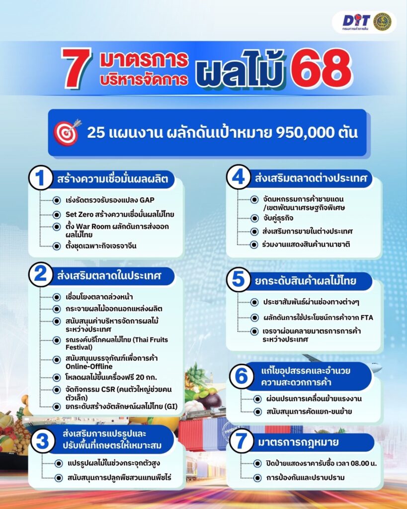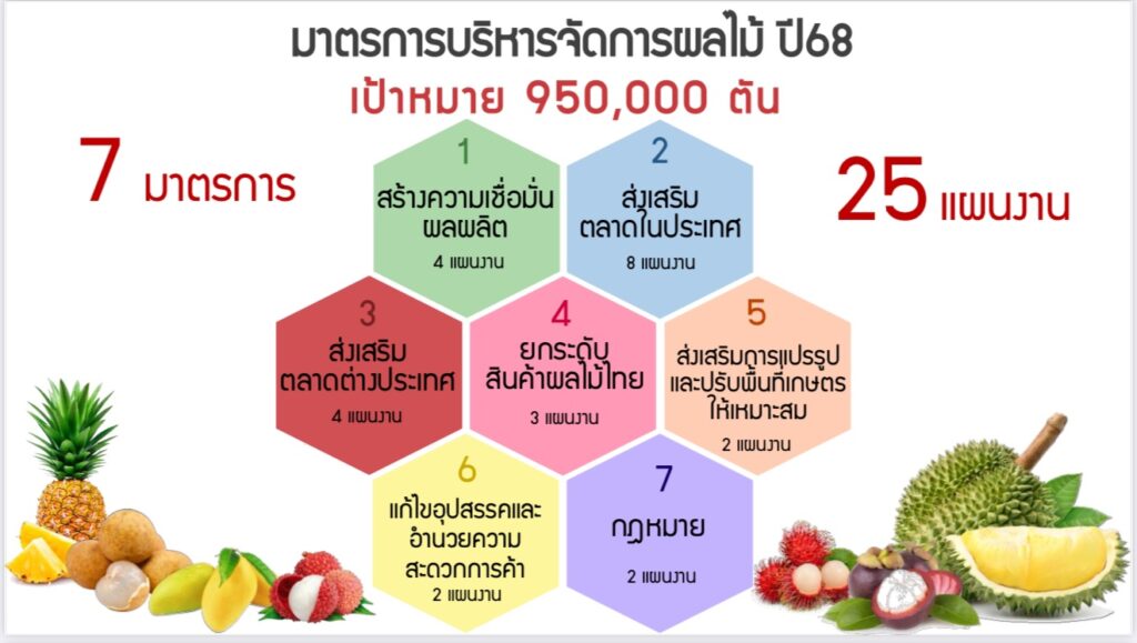สำหรับตลาดในประเทศ จะมีการเชื่อมโยงตลาดล่วงหน้า (Pre-Order) กระตุ้นการบริโภคผ่านแคมเปญ “Thai Fruits Festival” ซึ่งปีนี้คาดว่าจะได้รับความสนใจจากนักท่องเที่ยวที่เดินทางเข้าไทยกว่า 39 ล้านคน รวมถึงใช้กลไกพาณิชย์จังหวัดทั่วประเทศกระจายผลไม้ไปยังห้างค้าปลีกและตลาดท้องถิ่น เพื่อรักษาเสถียรภาพด้านราคา