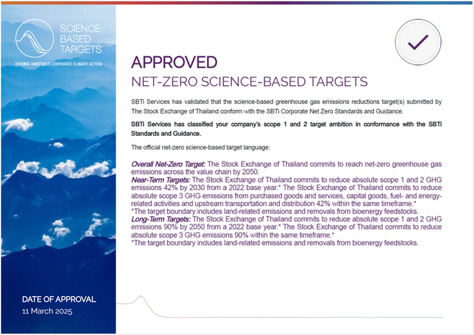 ทั้งนี้ การรับรองจาก SBTi ครอบคลุมการปล่อยก๊าซเรือนกระจกทั้ง 3 ขอบเขต ได้แก่ 1) การปล่อยก๊าซเรือนกระจกทางตรงจากกิจกรรมขององค์กร 2) การปล่อยก๊าซเรือนกระจกทางอ้อมจากการใช้พลังงาน และ 3) การปล่อยก๊าซเรือนกระจกทางอ้อมอื่นๆ ตลอดห่วงโซ่คุณค่า ทั้งนี้ เพื่อให้บรรลุเป้าหมายที่ตั้งไว้ ตลาดหลักทรัพย์ฯ ได้วางแผนการดำเนินงานครอบคลุมหลายด้าน อาทิ การเพิ่มสัดส่วนการใช้รถไฟฟ้าในการเดินทาง การปรับปรุงประสิทธิภาพการใช้พลังงานในอาคาร การพัฒนาการจัดซื้อจัดจ้างสีเขียว รวมถึงการร่วมพัฒนาแผนลดการปล่อยก๊าซเรือนกระจกกับคู่ค้า และการพัฒนาผลิตภัณฑ์และบริการที่สนับสนุนการลงทุนในธุรกิจที่เป็นมิตรต่อสิ่งแวดล้อมอย่างต่อเนื่อง