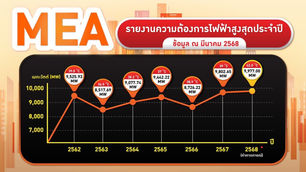 นายวิลาศ เฉลยสัตย์ ผู้ว่าการ MEA หรือการไฟฟ้านครหลวง เปิดเผยสถิติการใช้ไฟฟ้าในพื้นที่ของ MEA หรือการไฟฟ้านครหลวง ซึ่งประกอบด้วยกรุงเทพมหานคร นนทบุรี และสมุทรปราการ ว่า ตามที่ในช่วงฤดูร้อนจะเป็นช่วงฤดูที่มีการใช้ไฟฟ้ามากที่สุดในรอบปีนั้น สำหรับปี 2568 จากจำนวนผู้ใช้ไฟฟ้าประมาณ 4.32 ล้านราย MEA คาดการณ์ค่าพีคในระบบจำหน่ายของ MEA ไว้ที่ 9,977 เมกะวัตต์ เพิ่มขึ้นจากค่าสูงสุดของปี 2567 เท่ากับ 174 เมกะวัตต์ หรือคิดเป็น 1.77% จากปี 2567 ที่ผ่านมา โดยคาดว่าจะเกิดขึ้นในช่วงปลายเดือนเมษายน ถึงช่วงต้นเดือนพฤษภาคม เนื่องจากเป็นช่วงที่มีการใช้ไฟฟ้าสูง ประกอบกับสภาพอากาศร้อนเป็นอย่างมาก ตามการคาดหมายลักษณะอากาศช่วงฤดูร้อนของประเทศไทยของกรมอุตุนิยมวิทยา โดยอุณหภูมิสูงที่สุดจะอยู่ที่ 42 องศาเซลเซียส (ทั้งนี้ MEA รายงานความต้องการพลังงานไฟฟ้าสูงสุดปี 2568 จากข้อมูล ณ ปัจจุบัน เกิดขึ้นเมื่อวันที่ 25 มีนาคม 2568 ที่ผ่านมา อุณหภูมิสูงสุด 36.6 องศาเซลเซียส เวลา 15.30 – 16.00 น. ที่ 8,758.63 เมกะวัตต์)