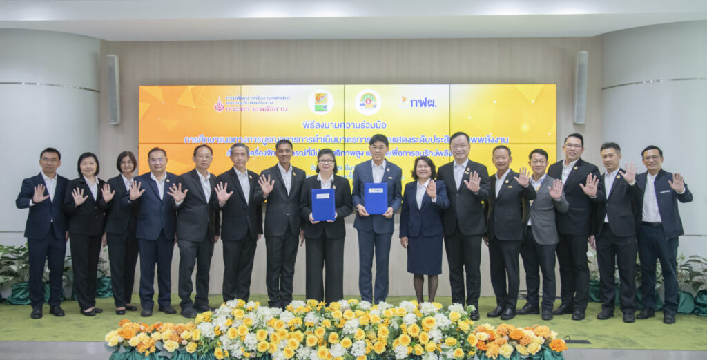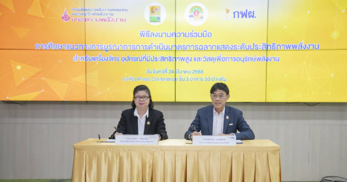 นางสาวนันธิกา ทังสุพานิช อธิบดีกรมพัฒนาพลังงานทดแทนและอนุรักษ์พลังงาน (พพ.) พร้อมด้วย นายเทพรัตน์ เทพพิทักษ์ ผู้ว่าการการไฟฟ้าฝ่ายผลิตแห่งประเทศไทย (กฟผ.) ร่วมลงนามความร่วมมือการศึกษาแนวทางการบูรณาการการดำเนินมาตรการฉลากแสดงระดับประสิทธิภาพพลังงาน สำหรับเครื่องจักร อุปกรณ์ที่มีประสิทธิภาพสูง และวัสดุเพื่อการอนุรักษ์พลังงาน เพื่อพัฒนารูปแบบฉลากแสดงประสิทธิภาพพลังงานให้เป็นแนวทางเดียวกันและเป็นภาพรวมของประเทศ ณ สำนักงานใหญ่ กฟผ. จ.นนทบุรี