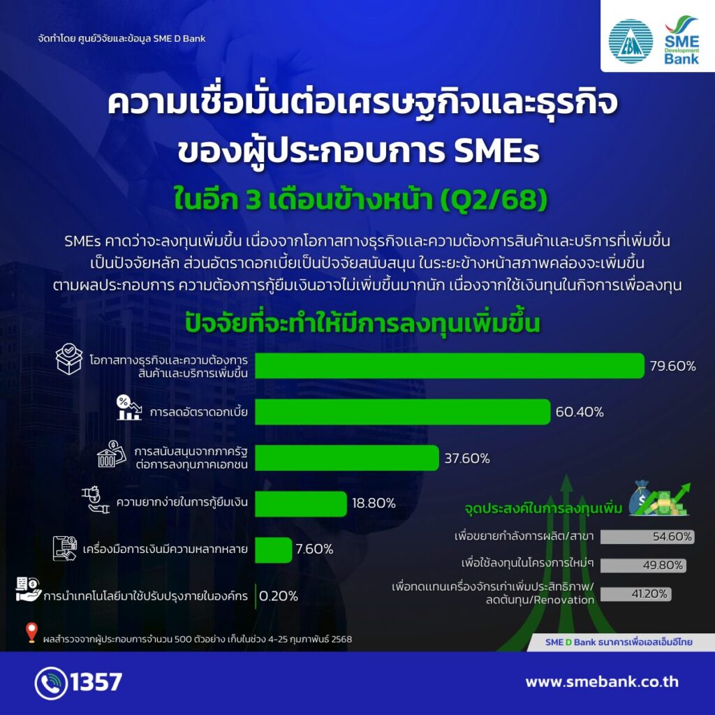 ผู้ประกอบการ SMEs ในทุกพื้นที่ มีคาดการณ์ในอีก 3 เดือนข้างหน้า เชื่อมั่นแนวโน้มเชิงบวก โดยในพื้นที่เมืองรอง แนวโน้มเชื่อมั่นเพิ่มขึ้นมากกว่าเมืองใหญ่เล็กน้อย ส่งผลให้ในภาพรวมมีสัดส่วนผู้ประกอบการ SMEs ที่ตอบว่าจะลงทุนเพิ่มขึ้น รวมถึงสภาพคล่องยังคงเพิ่มขึ้น โดยปัจจัยที่จูงใจให้ผู้ประกอบการ SMEs จะลงทุนเพิ่ม ได้แก่ เห็นโอกาสเติบโตทางเศรษฐกิจเป็นปัจจัยหลัก โดยวัตถุประสงค์อันดับหนึ่งเพื่อขยายกำลังการผลิตและการลงทุนในโครงการใหม่