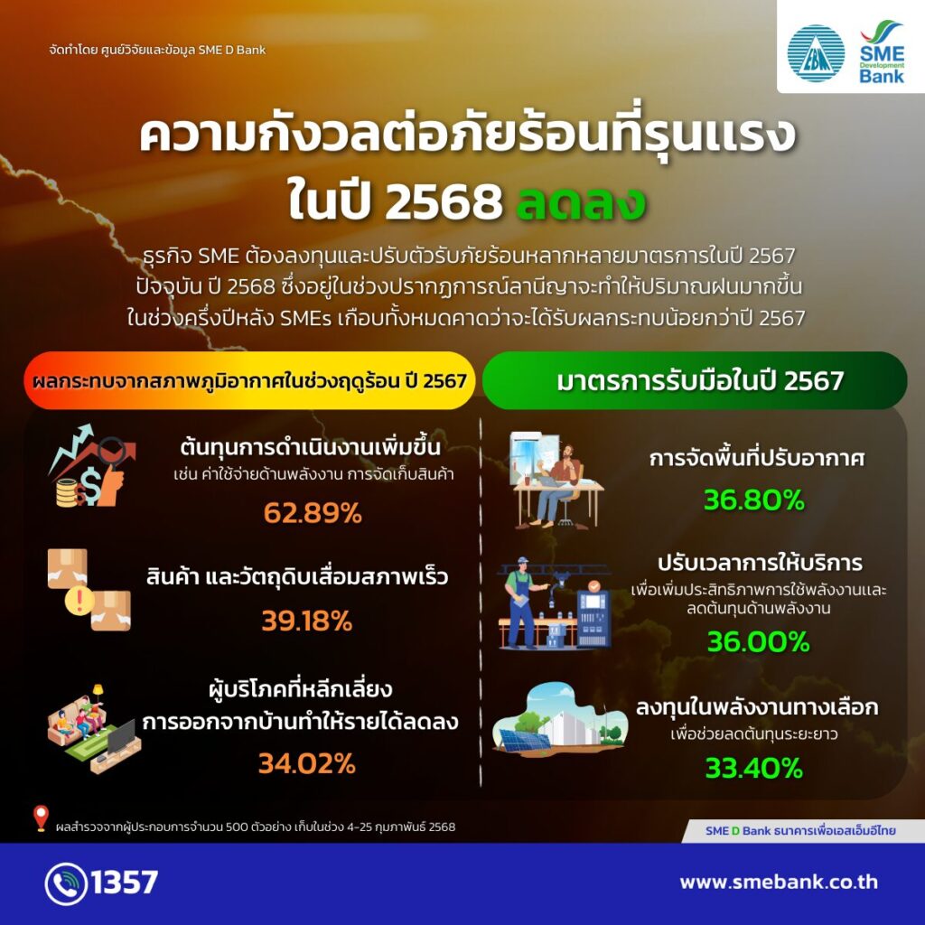 ภาพรวมสัดส่วนผู้ประกอบการ SMEs ที่มีความต้องการสินเชื่อ SMEs ในอีก 3 เดือนข้างหน้า คิดเป็น 52.20% เพื่อใช้เป็นเงินทุนหมุนเวียนสัดส่วน 41.20% และเพื่อลงทุน 11.00% อย่างไรก็ตาม แม้ความต้องการลงทุนจะเพิ่มขึ้น แต่ความต้องการสินเชื่อเพื่อลงทุนในธุรกิจ ไม่ได้อยู่ในสัดส่วนที่สูงมากนัก เนื่องจากธุรกิจมีสภาพคล่องสูง มีแหล่งเงินทุนภายในธุรกิจเพียงพอที่จะขยายการลงทุนอยู่แล้ว และเมื่อพิจารณาแยกตามพื้นที่ความต้องการสินเชื่อ ผู้ประกอบการ SMEs ในเมืองรองมีความต้องการสูงกว่าเมืองใหญ่ โดยเฉพาะเพื่อเป็นทุนหมุนเวียนในธุรกิจ แม้ไตรมาส 2 เริ่มเข้าสู่ช่วงฤดูร้อน แต่ปัจจุบัน ปี 2568 อยู่ในช่วงปรากฏการณ์ลานีญา ทำให้มีปริมาณฝนมากขึ้นในช่วงครึ่งปีหลัง ทำให้ผู้ประกอบการ SMEs เกือบทั้งหมด จึงคาดว่า ได้รับผลกระทบน้อยกว่าปี 2567 ที่ผ่านมา และไม่ได้รับผลกระทบจากภัยร้อนที่รุนแรง อย่างไรก็ตาม ในปีที่ 2567 ที่ผ่านมา ผู้ประกอบการ SME ต้องลงทุนและปรับตัวรับภัยร้อนหลากหลายมาตรการ แต่ความกังวลลดลงในปี 2568 รวมถึง ในปี 2567 ที่ผ่านมา ผู้ประกอบการ SMEs ยังต้องเผชิญกับต้นทุนการดำเนินงานที่เพิ่มขึ้น โดยเฉพาะค่าใช้จ่ายด้านพลังงาน และต้นทุนการจัดเก็บสินค้า ตามด้วยปัญหาสินค้าและวัตถุดิบเสื่อมสภาพ และพฤติกรรมของลูกค้าเปลี่ยนไป ส่งผลให้รายได้ของธุรกิจลดลง ดังนั้น จึงต้องลงทุนยกระดับปรับเปลี่ยนธุรกิจ รูปแบบหรือกระบวนการ เพื่อลดต้นทุนธุรกิจ เช่น การจัดพื้นที่ปรับอากาศ ปรับเวลาการให้บริการ และลงทุนในพลังงานทางเลือก เป็นต้น