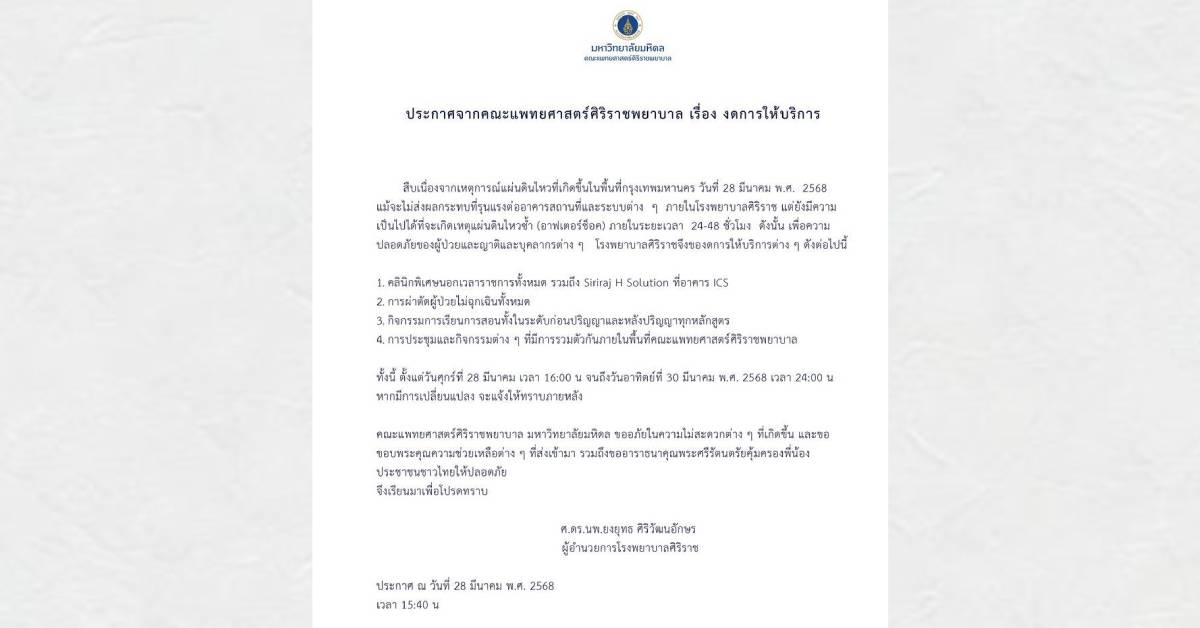 ศ.ดร.นพ.ยงยุทธ ศิริวัฒนอักษรผู้อำนวยการโรงพยาบาลศิริราช แจ้งว่า สืบเนื่องจากเหตุการณ์แผ่นดินไหวที่เกิดขึ้นในพื้นที่กรุงเทพมหานคร วันที่ 28 มีนาคม พ.ศ.2568 แม้จะไม่ส่งผลกระทบที่รุนแรงต่ออาคารสถานที่และระบบต่าง ๆ ภายในโรงพยาบาลศิริราช แต่ยังมีความเป็นไปได้ที่จะเกิดเหตุแผ่นดินไหวช้ำ (อาฟเตอร์ช็อค) ภายในระยะเวลา 24-48 ชั่วโมง ดังนั้น เพื่อความปลอดภัยของผู้ป่วยและญาติและบุคลากรต่าง ๆ โรงพยาบาลศิริราชจึงของดการให้บริการต่าง ๆ ดังต่อไปนี้