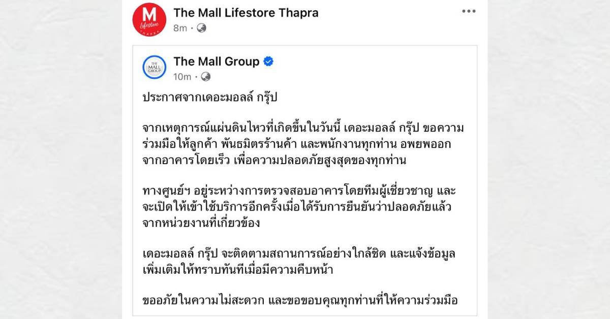 จากเกิดเหตุการณ์แผ่นดินไหวที่ส่งผลกระทบหลายพื้นที่ในกรุงเทพมหานครและปริมณฑล ในช่วงบ่ายวันนี้ ( 28 มี.ค.) ห้างสรรพสินค้า ที่ทำการภาครัฐ เอกชน ต่างเป็นห่วงความปลอดภัยของพนักงานและลูกค้า จึงปิดบริการหลังเกิดแผ่นเดินไหว เช่น กลุ่มแดอะมอลล์ ประกาศเพื่อความปลอดภัยของพนักงานและลูกค้า จากเหตุการณ์แผ่นดินไหวที่เกิดขึ้นในวันนี้ เดอะมอลล์ กรุ๊ป ขอความ ร่วมมือให้ลูกค้า พันธมิตรร้านค้า และพนักงานทุกท่าน อพยพออกจากอาคารโดยเร็ว เพื่อความปลอดภัยสูงสุดของทุกท่าน ทางศูนย์ฯ อยู่ระหว่างการตรวจสอบอาคารโดยทีมผู้เชี่ยวชาญ และจะเปิดให้เข้าใช้บริการอีกครั้งเมื่อได้รับการยืนยันว่าปลอดภัยแล้วจากหน่วยงานที่เกี่ยวข้อง